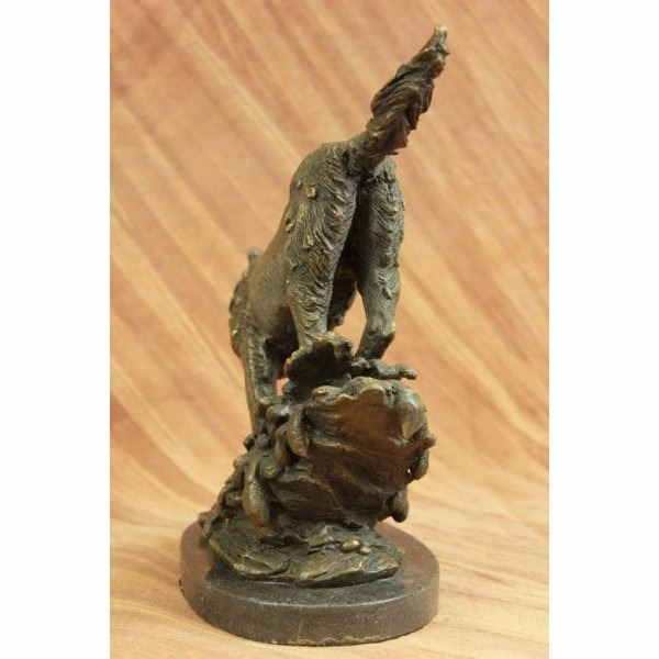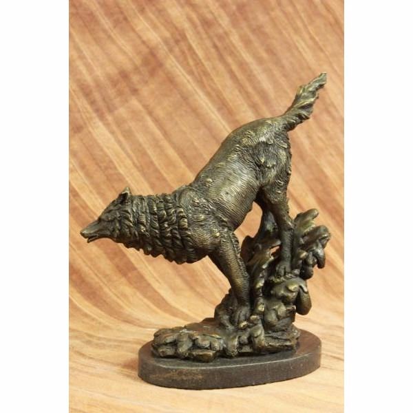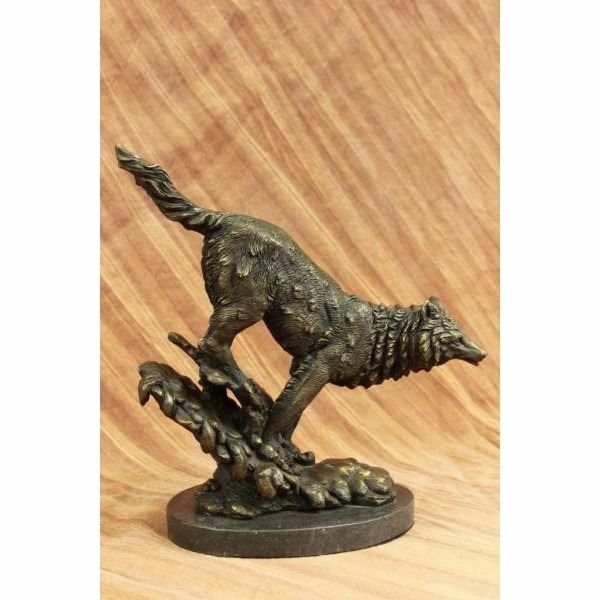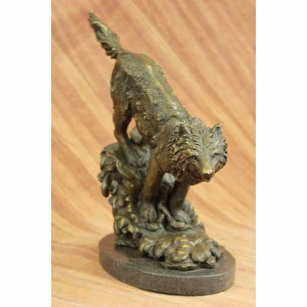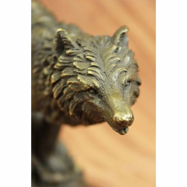 Humans historically have had a complex and varied viewpoint of wolves. In many parts of the world, wolves were respected and revered, while in others they were feared and held in distaste. The latter viewpoint was notably accentuated in European folklore beginning in the Christian era, though wolves did feature as heraldic animals on the arms and crests of numerous noble families. Many languages have given names almost universally masculine meaning wolf. Wolves also figure prominently in proverbs. This is an excellent piece depicting a cunning and mysterious wolf, featuring the lost wax method of casting, founded thousands of years ago ensuring an exquisitely detailed sculpture that will add grace and beauty to your business or home. Bronze Dimensions with Marble Base: Height 10 X Width 10 inches. Weight: 8 LBS. Please Note: This is a reproduction bronze sculpture from the original molded and signed. This featured bronze sculpture is a recast after the original, and has been done recently. This 100% bronze sculpture is an abstract piece certain to be a conversation piece.