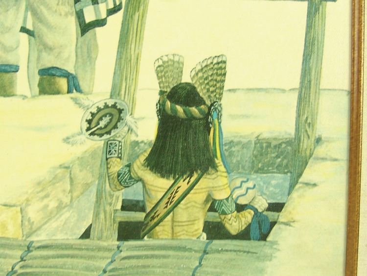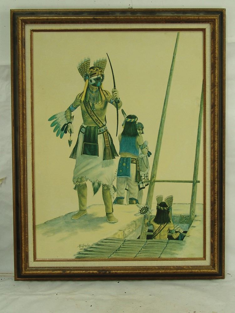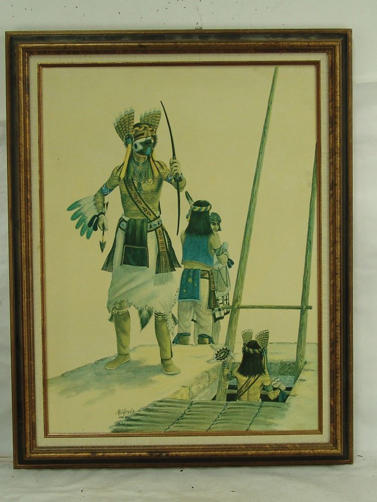 Large and impressive color canvas gicleé showing figures entering from the Kiva. Very good condition. In custom frame.,Mid/Late 1900s,29" x 22"