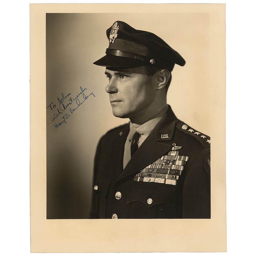 United States Air Force general (1899–1954) who served as the second Chief of Staff of the Air Force and as the second Director of Central Intelligence. Vintage matte-finish 8.75 x 11.25 photo of General Vandenberg wearing his four-star uniform, signed and inscribed in fountain pen, "To John, with best wishes, Hoyt S. Vandenberg.” In fine condition.