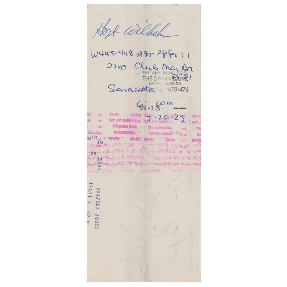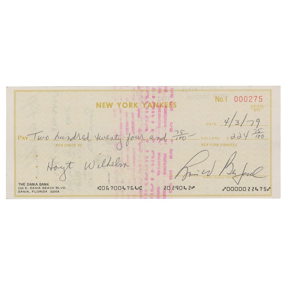 New York Yankees business check, 8.5 x 3.5, filled out in another hand and made payable to Hoyt Wilhelm for $224.75, April 3, 1979, endorsed on the reverse in ballpoint by Wilhelm. In fine condition.
