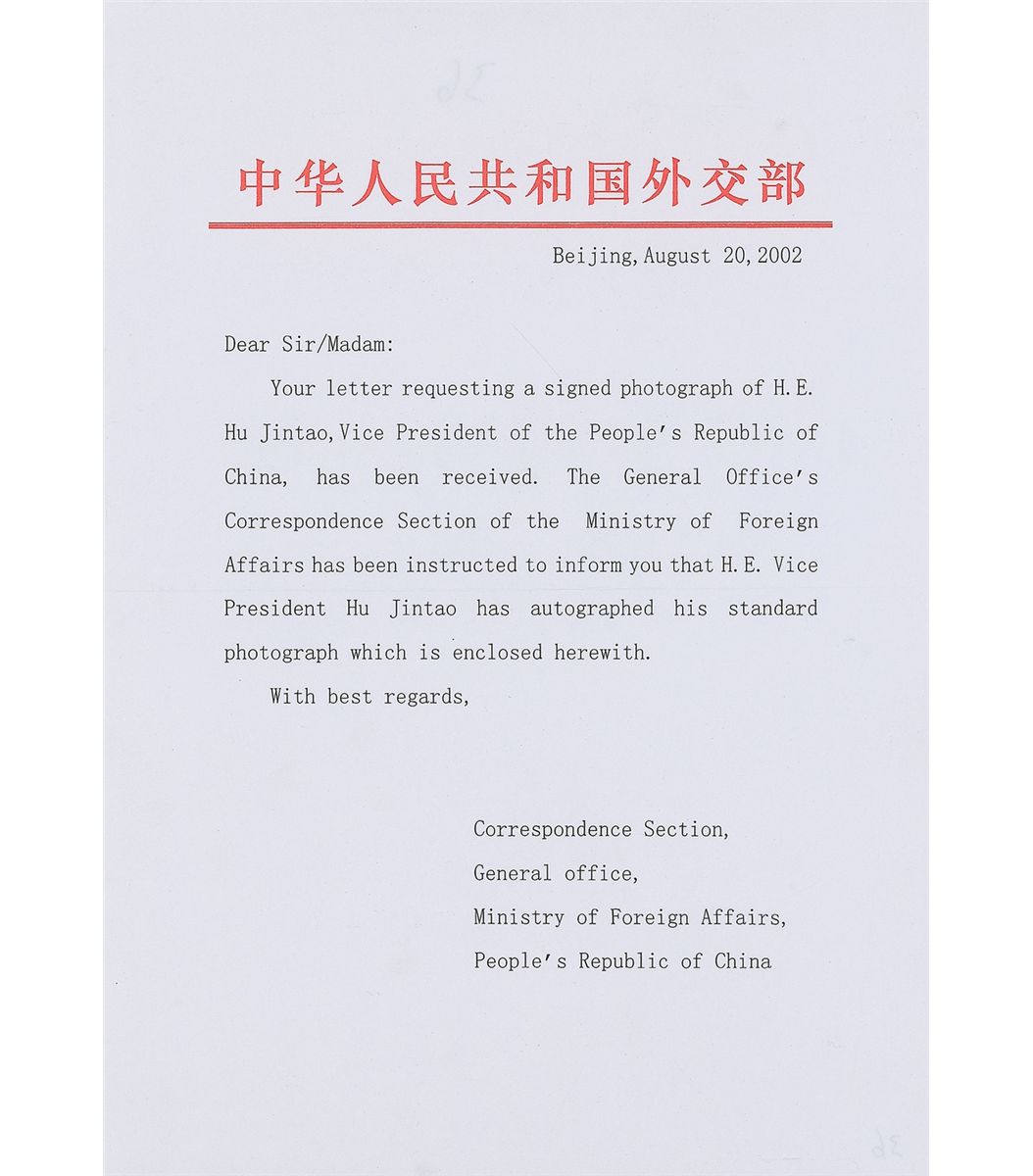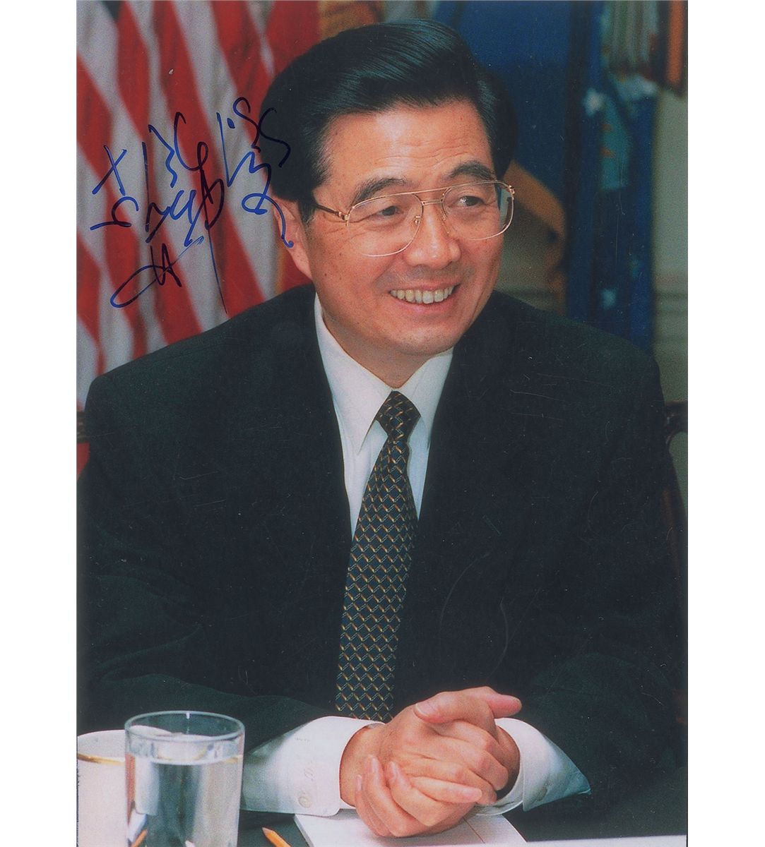 Paramount leader of China (born 1942) who held several high-level positions, including sixth president of the People’s Republic of China (2003–2013). Color glossy 5 x 7 photo, signed in blue felt tip in Chinese. Minor surface creasing and photo being affixed to a same-sized piece of cardstock, otherwise fine condition. Accompanied by a 2002 letter of transmittal from the Ministry of Foreign Affairs. Over his decade-long tenure, Hu witnessed consistent economic growth and development, cementing China as a major world power.