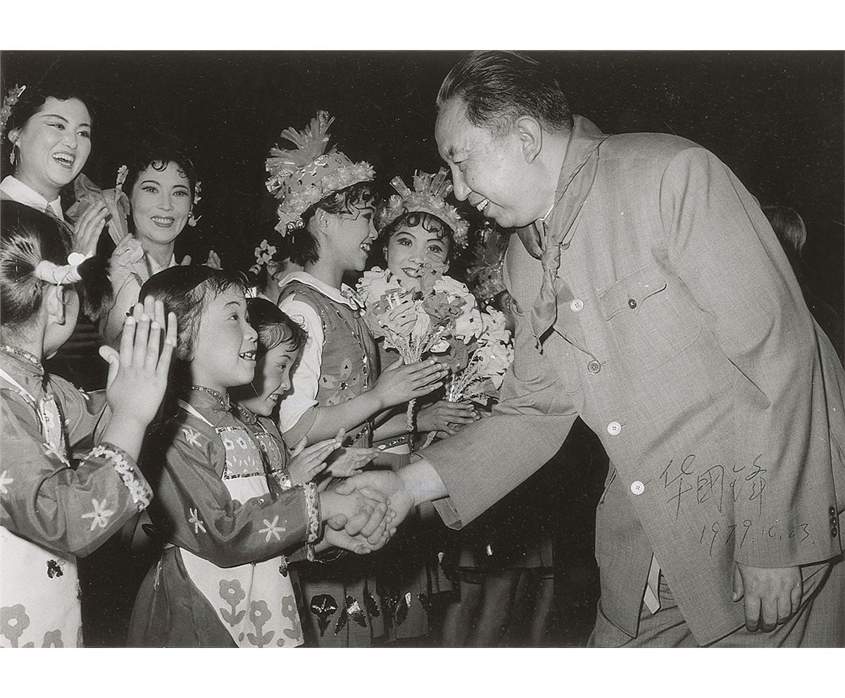 Premier of the People's Republic of China (1921–2008) who served from 1976–1980; he was eventually outmaneuvered by Deng Xiaoping, who forced Hua into early retirement. Hua is generally remembered as a benign transitional figure in modern Chinese political history. Glossy 11.75 x 8.25 press photo of Chairman Hua Guofeng greeting a group of costumed children, signed in black ballpoint and dated October 23, 1979. Reverse bears a Xinhua News Agency stamp and caption. In fine condition, with scattered bends and creases, subtle spotting to finish, and slightly trimmed edges.