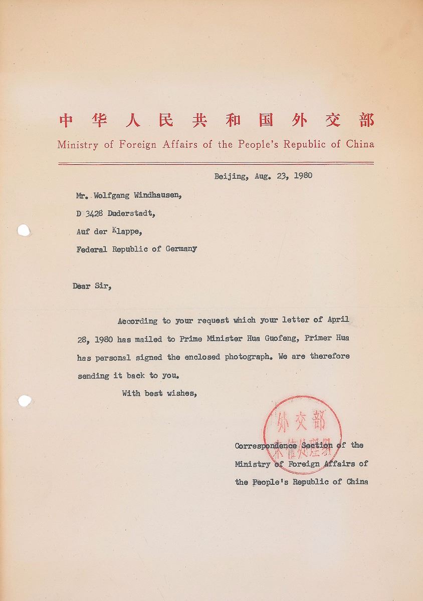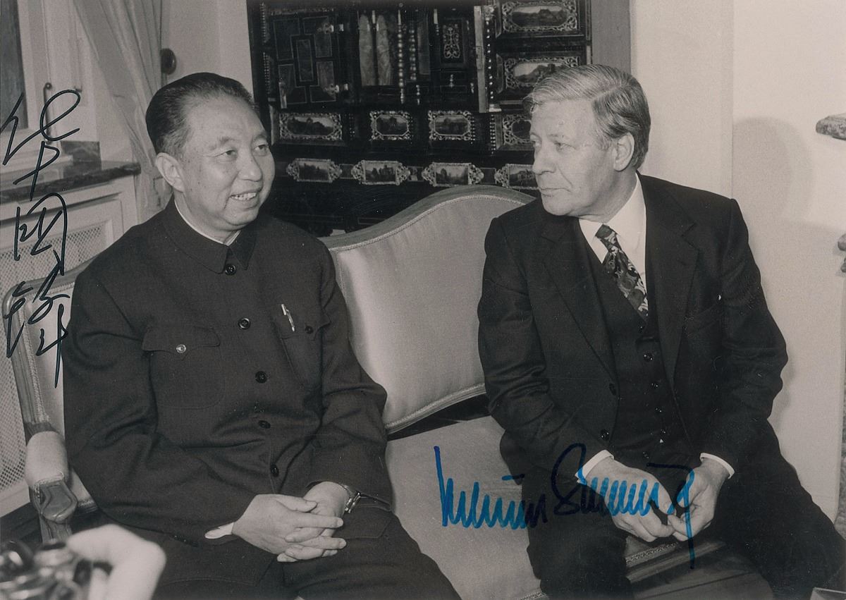 Premier of the People's Republic of China (1921–2008) who served from 1976–1980; he was eventually outmaneuvered by Deng Xiaoping, who forced him into early retirement. Attractive glossy 7 x 5 photo, signed by Hau in black felt tip in Chinese. Photo also bears an autopen signature of Helmut Schmidt. In fine condition, with some minor spots of silvering to a few dark areas of the photo. Accompanied by a 1980 letter of transmittal from China’s Ministry of Foreign Affairs. This photograph was captured October 23, 1979, during a round of talks between the two nations in Bonn, Germany. That year, China and Germany entered into an agreement allowing China to study the German system of DIN norms and standards and transfer it to China; as a result, early 1980s Chinese product standards closely followed those of Germany. An extremely rare Chinese autograph with official documentation.