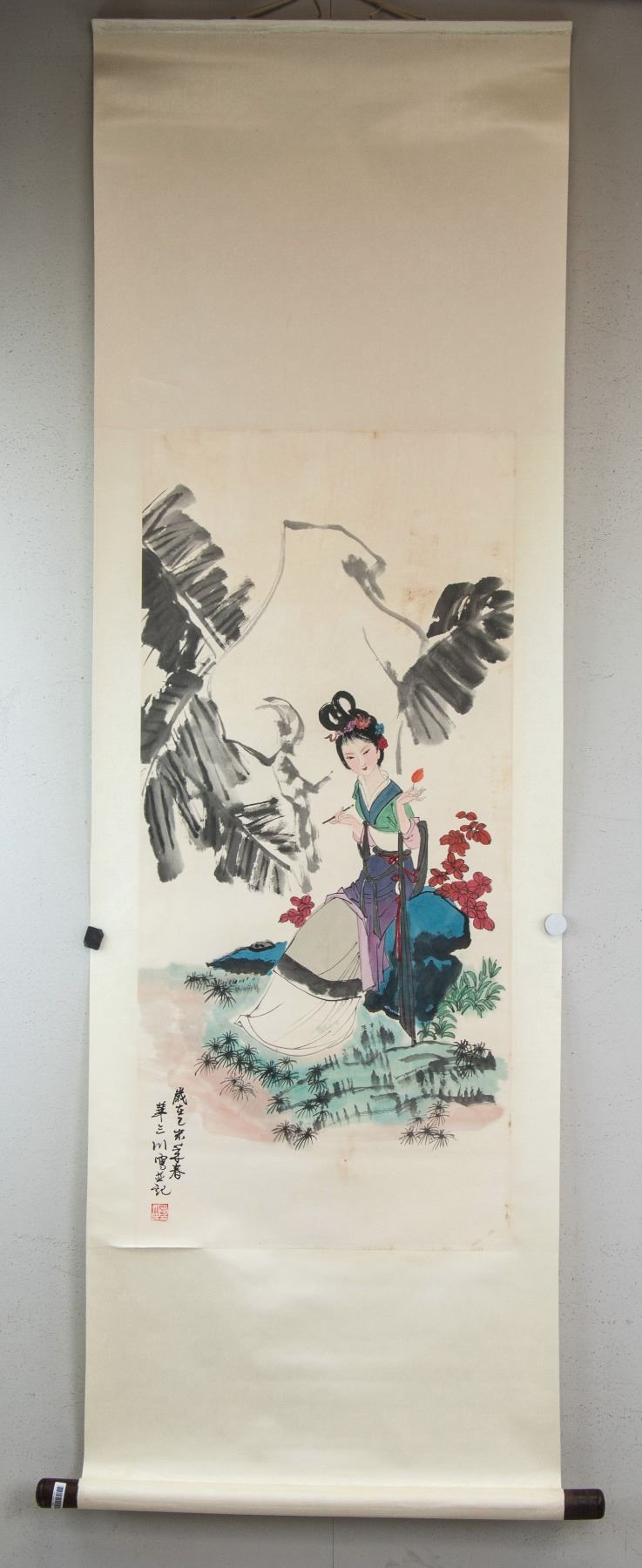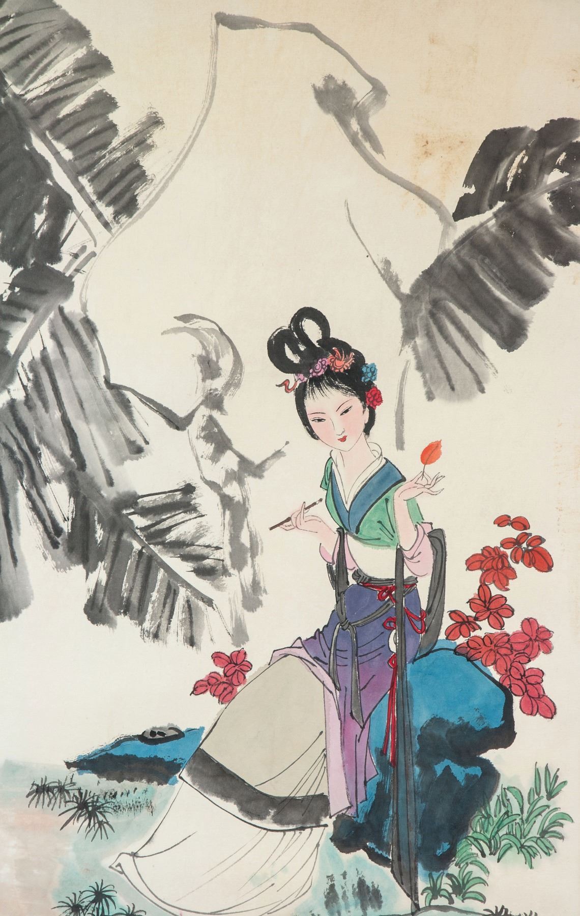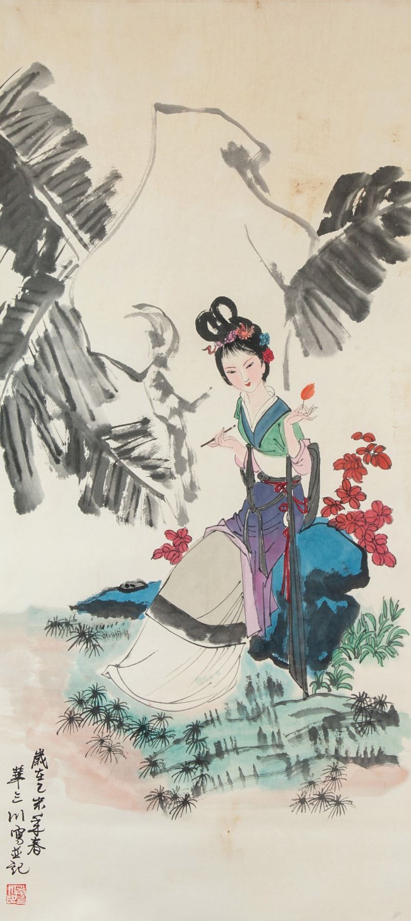 Painting of beauty; Chinese ink and watercolour on paper; hanging scroll; signed Hua Sanchuan (1930-2004); inscribed with 1 artist seals; 95 cm x 44 cm