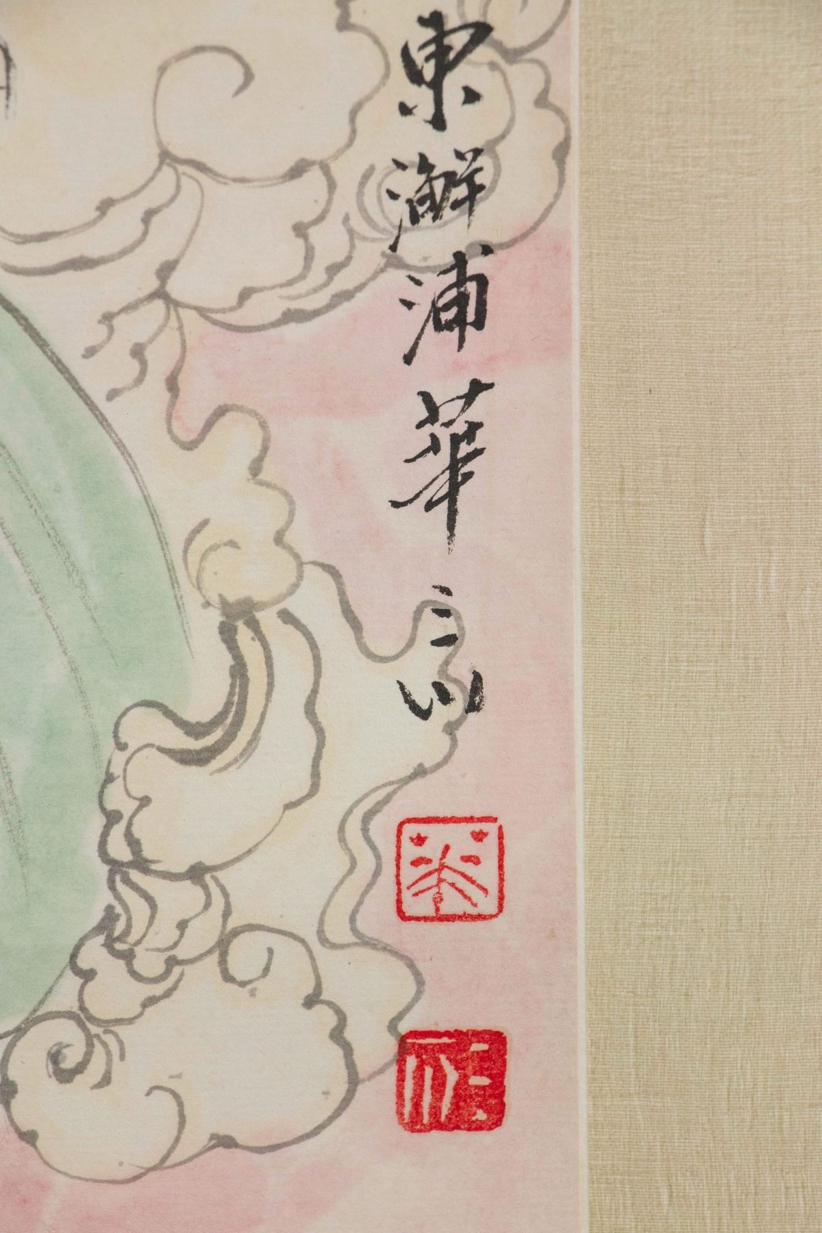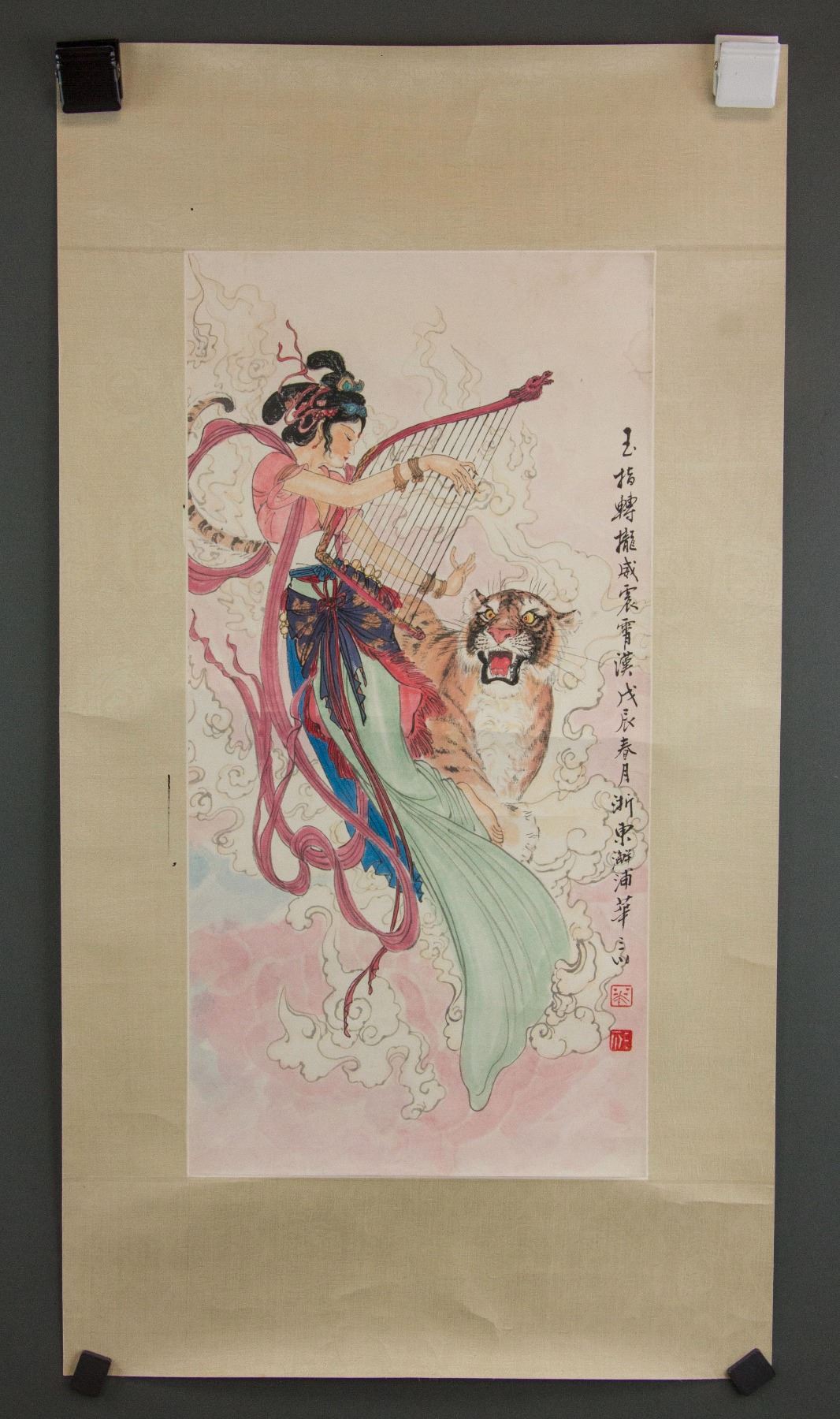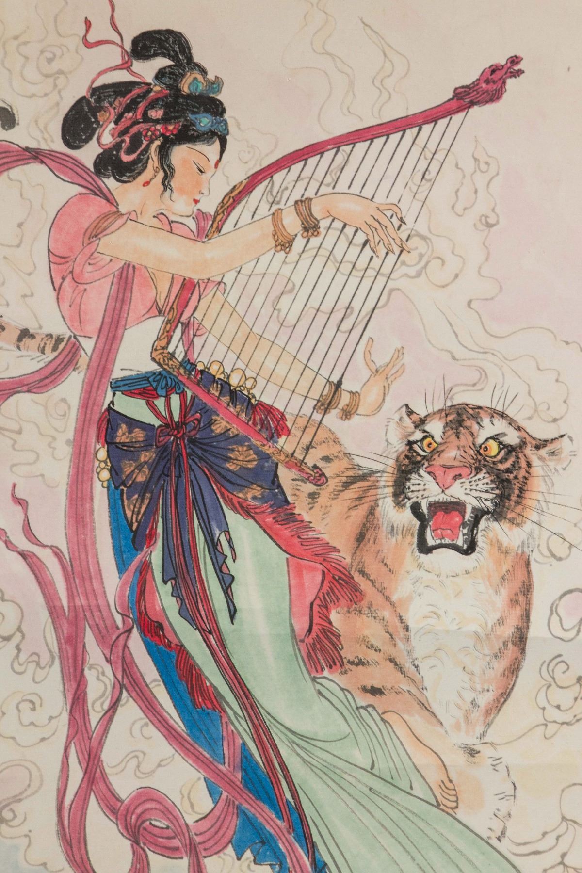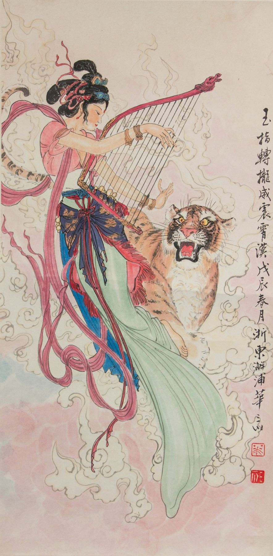 Fairy playing harp with tiger; Chinese ink and watercolour on paper; signed Hua Sanchuan (1930-2004); inscribed with 2 artist seal; 56 cm x 28 cm