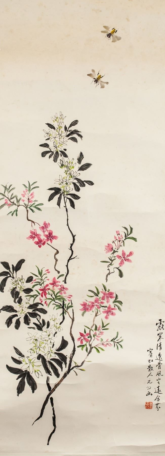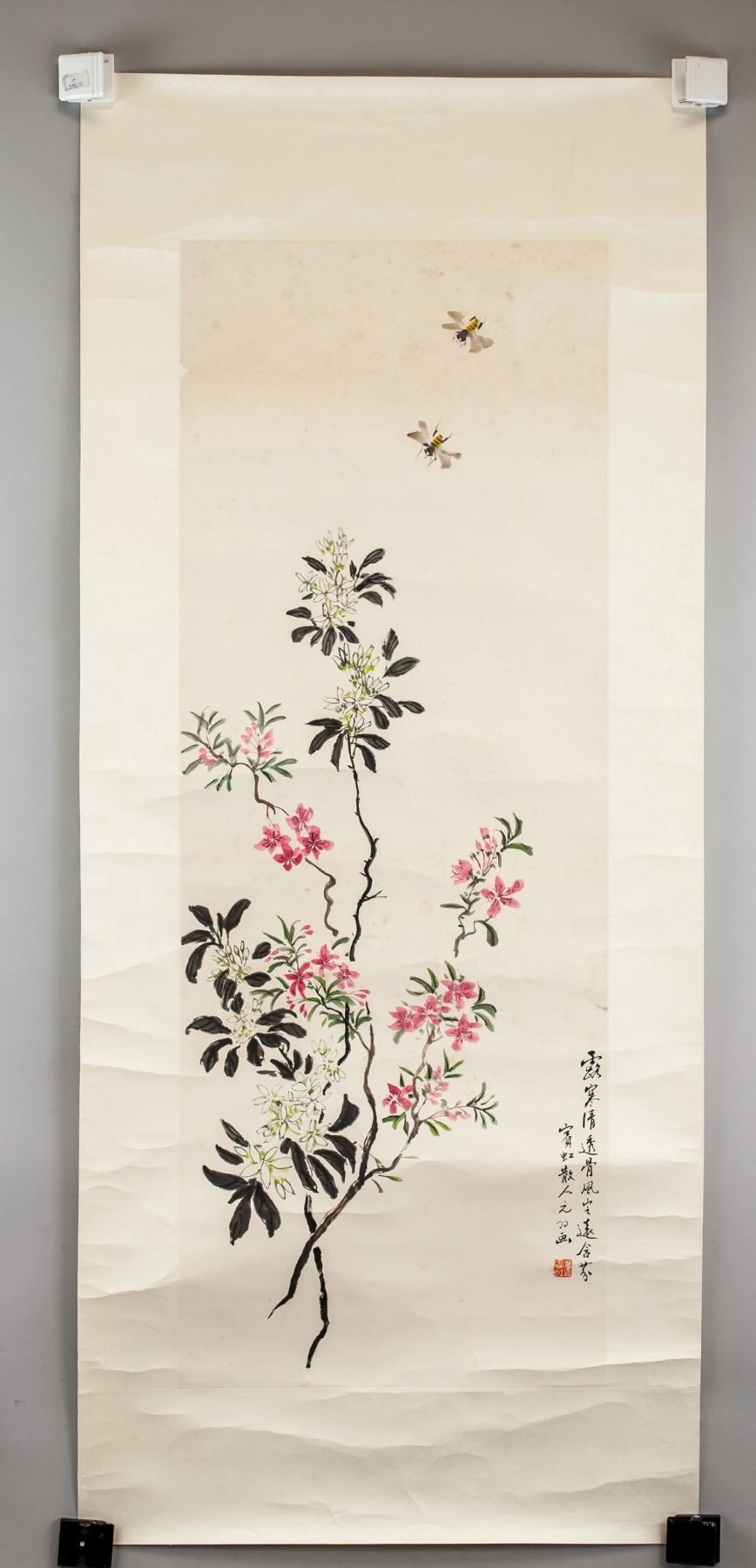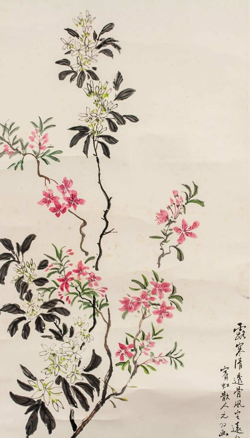 Ink and watercolor on paper, paper scroll. Featuring flowers. Signed Huang Baohong (Chinese), inscribed with 1 artist mark. 89 x 33.5 cm