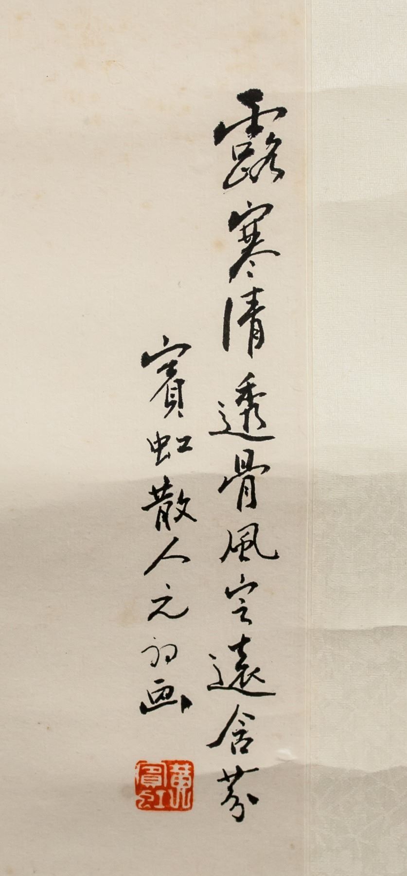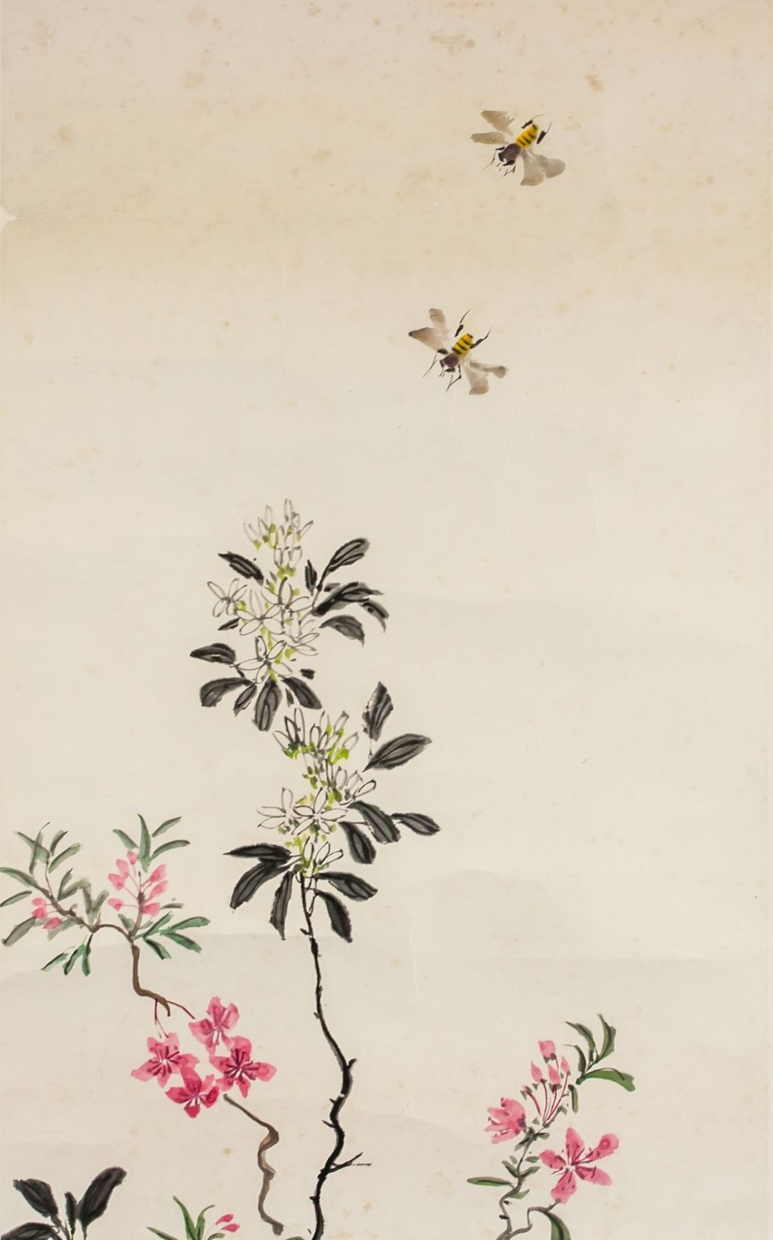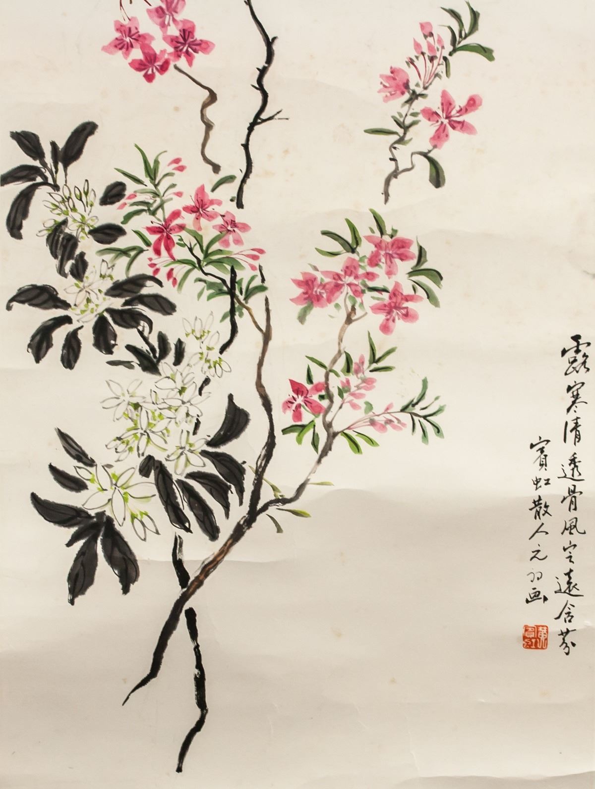 Ink and watercolor on paper, paper scroll. Featuring flowers. Signed Huang Baohong (Chinese), inscribed with 1 artist mark. 89 x 33.5 cm