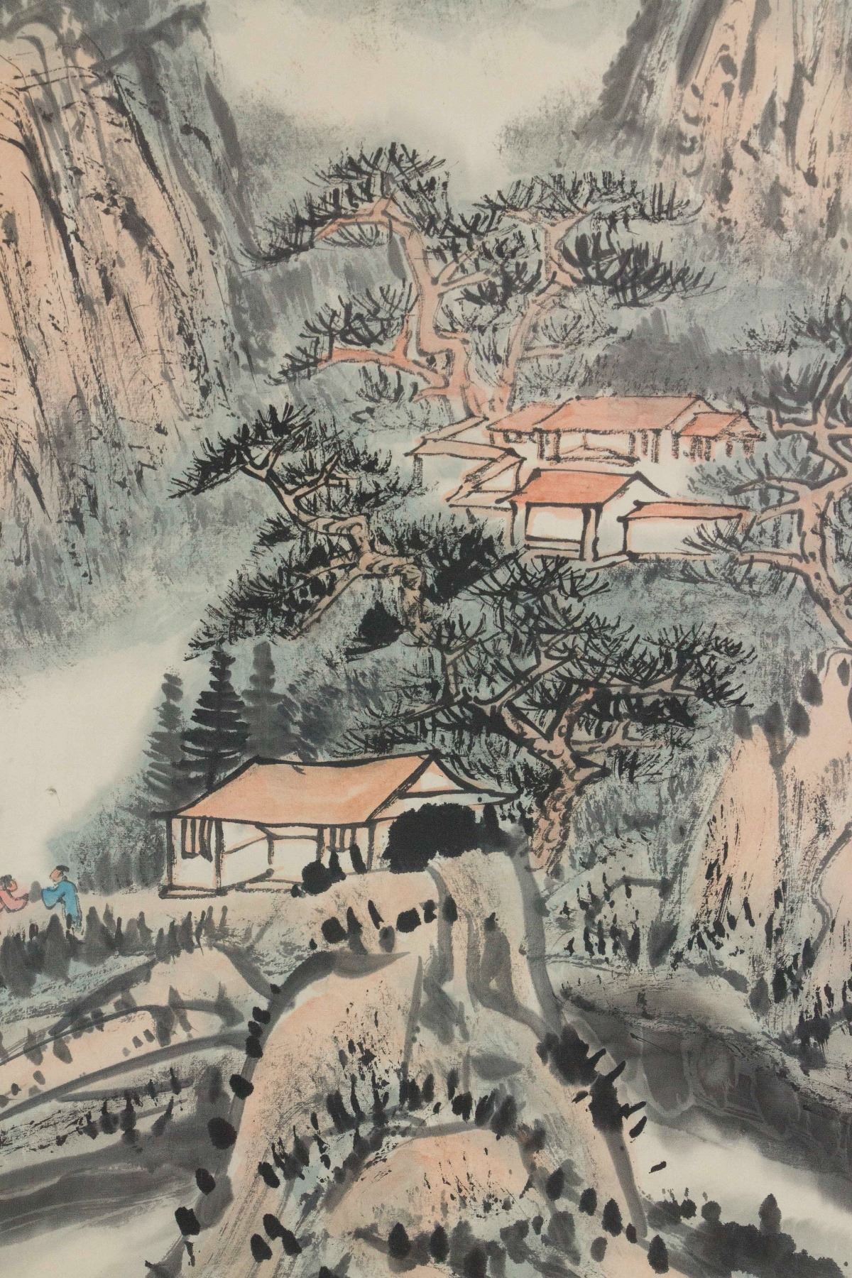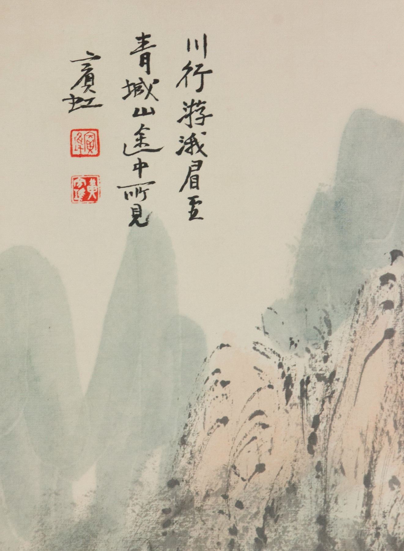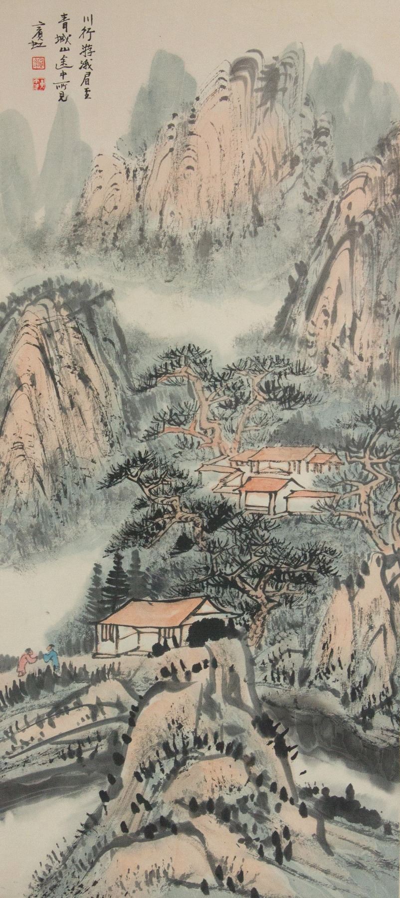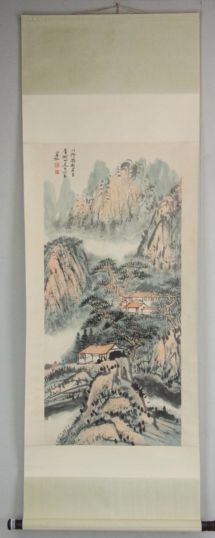 Mountainous landscape and village; Chinese ink and watercolour on paper; hanging scroll; signed Huang Binhong (1865-1955); inscribed with 2 artist seals; 96 cm x 43 cm