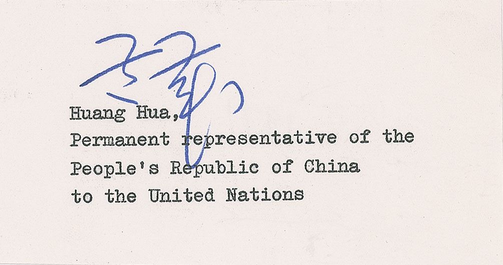 Felt tip signature of Huang Hua on an off-white 4.5 x 2.25 sheet with typed notations. In fine condition.