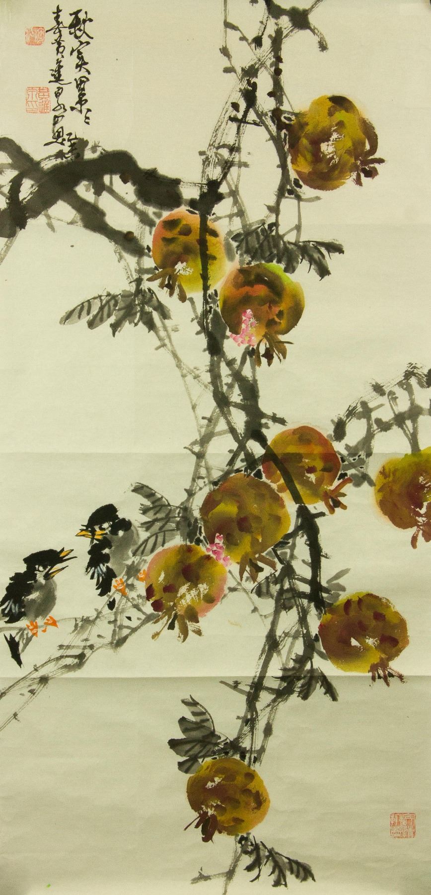 Two sparrow on pomegranate tree; Chinese ink and watercolour on paper; signed Huang Jinquan (b.1940); inscribed with 3 artist seals; 99 cm × 49 cm