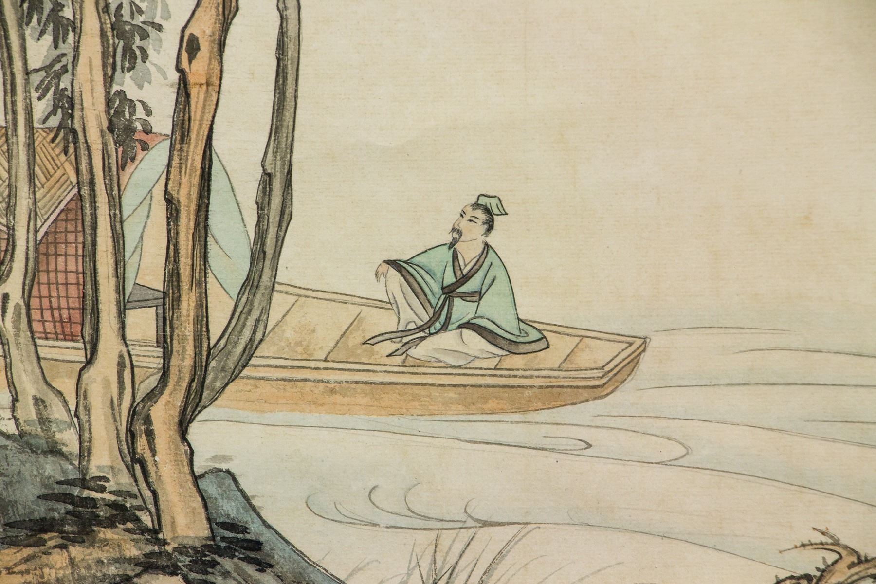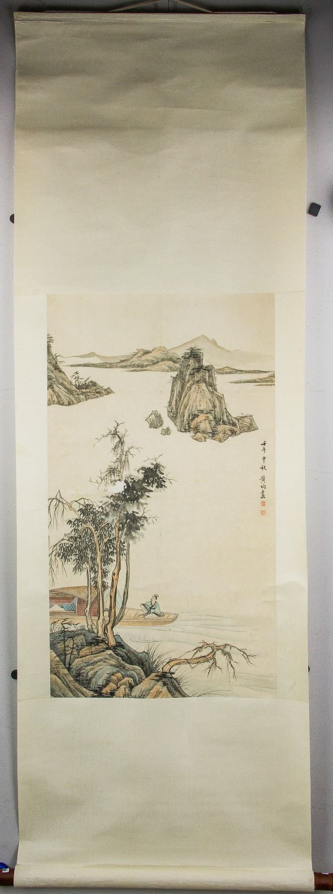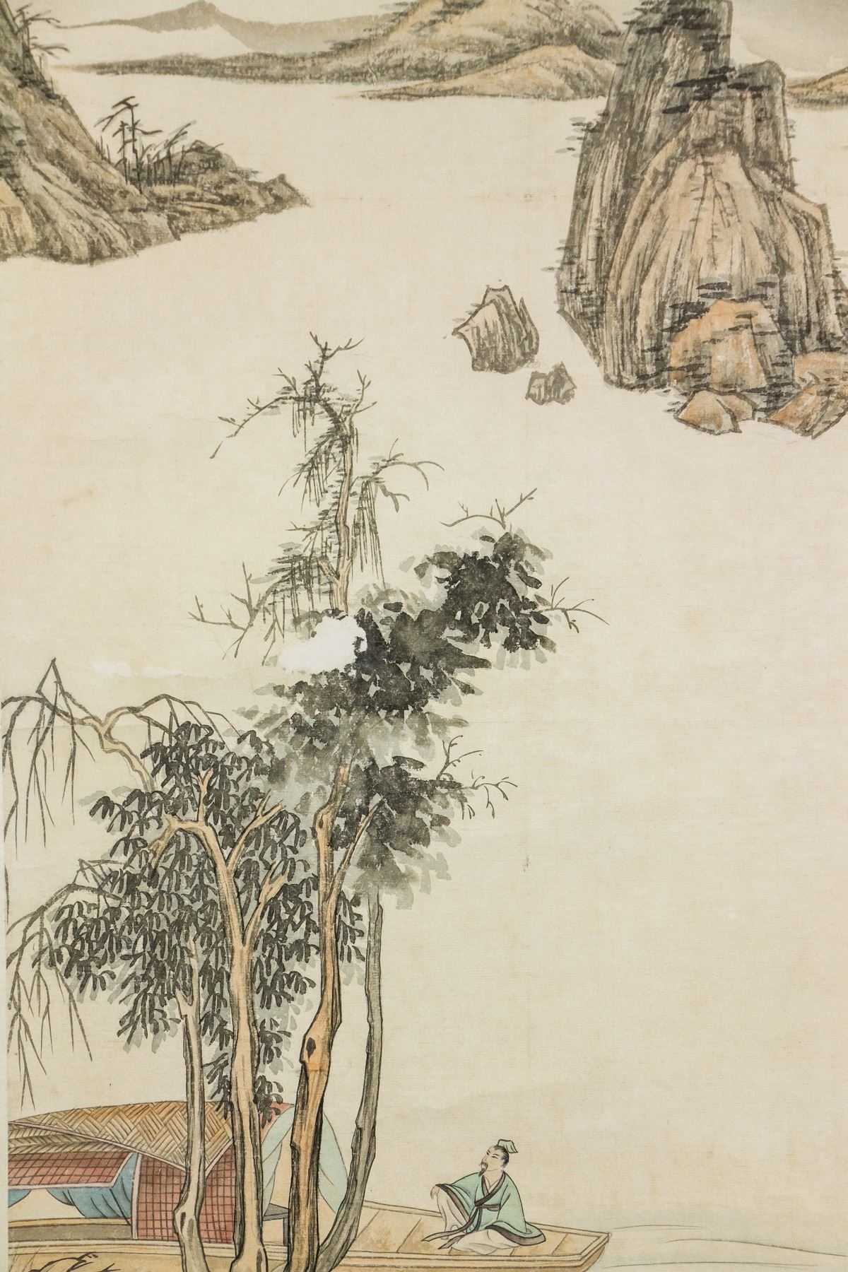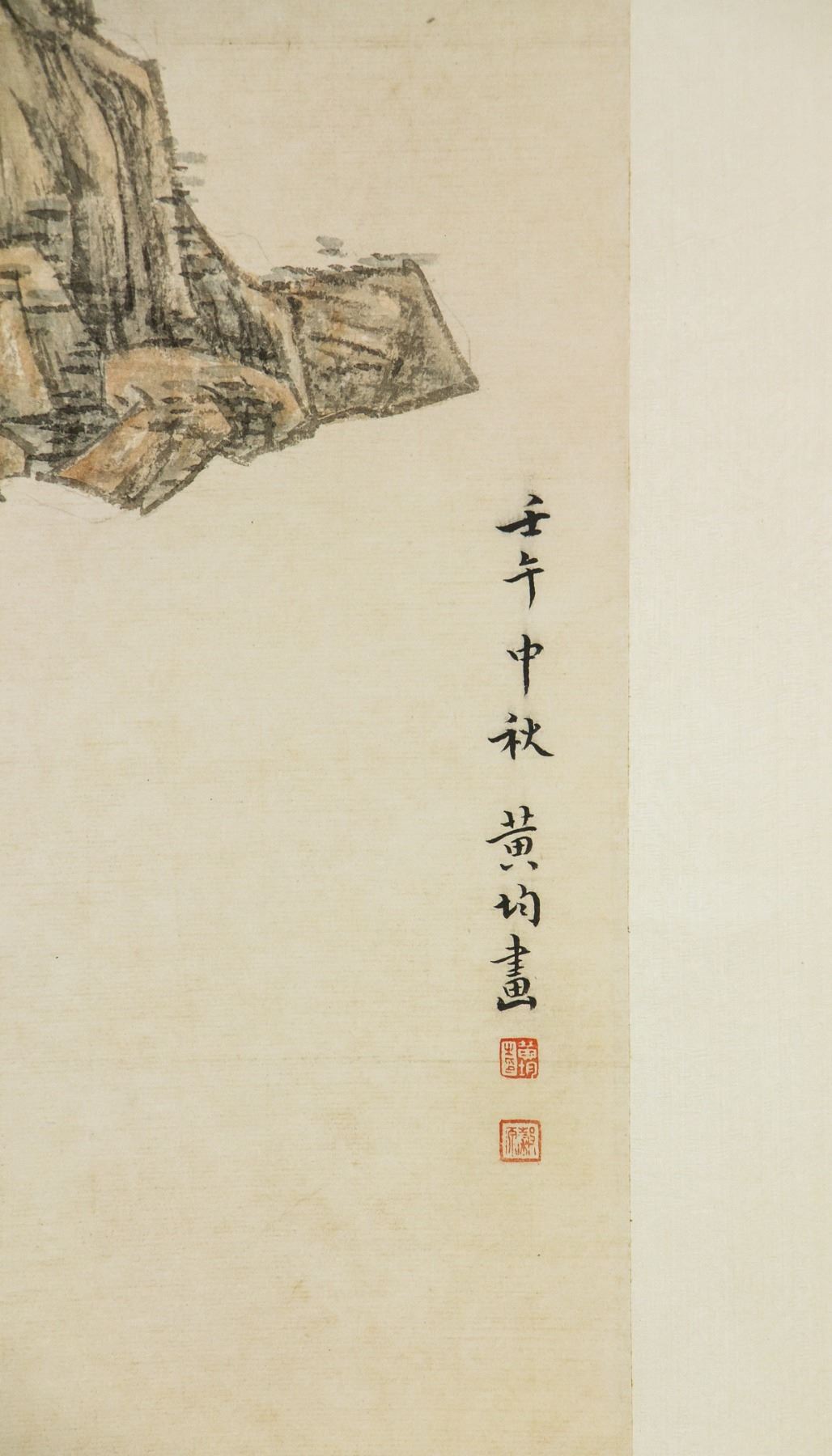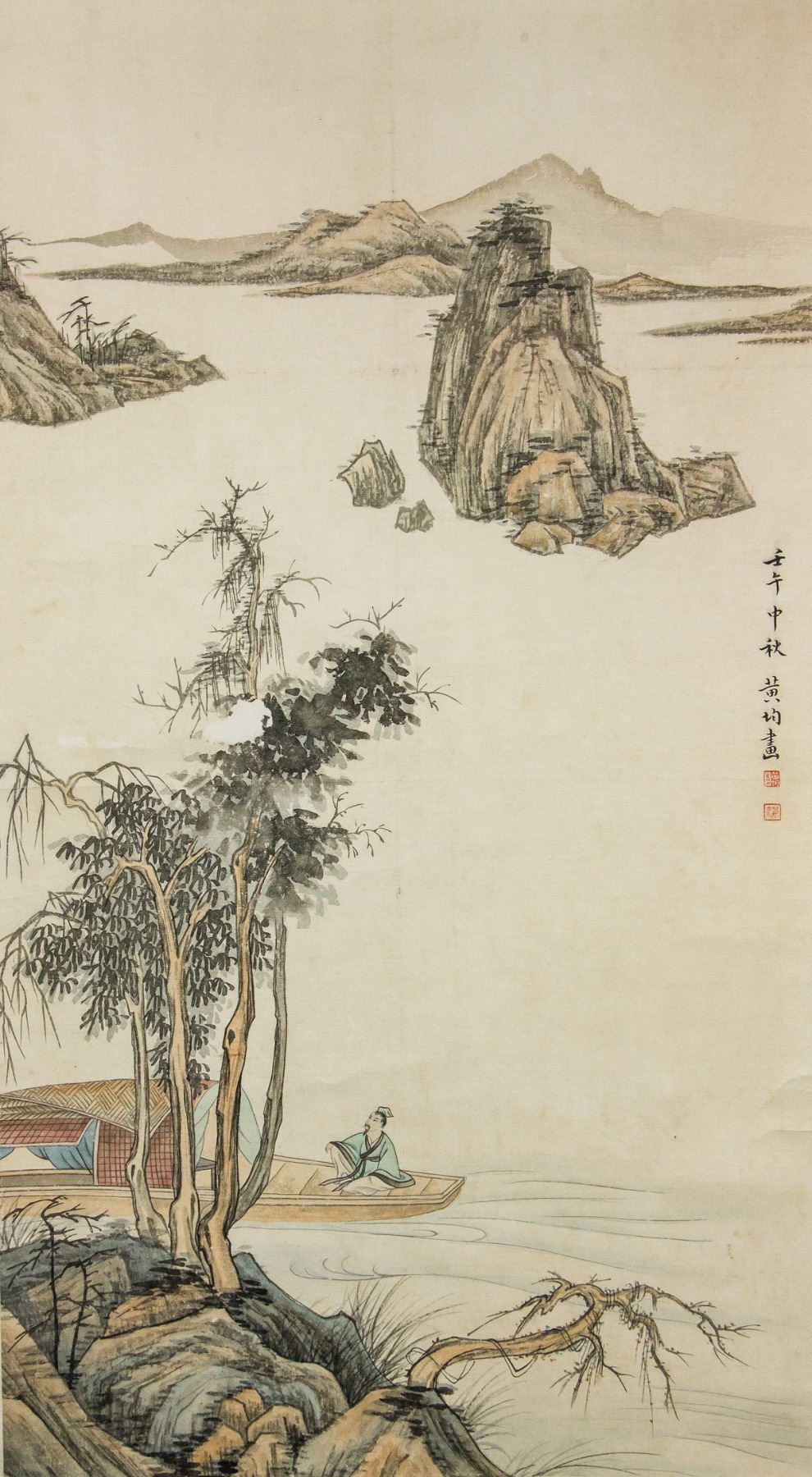 Ink and watercolor on paper; hanging scroll. Featuring boating in the sea. Signed Huang Jun 1775-1850 Chinese, inscribed with one artist seal. 180 × 72 cm