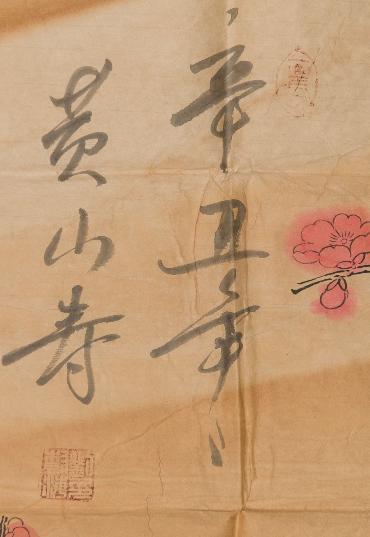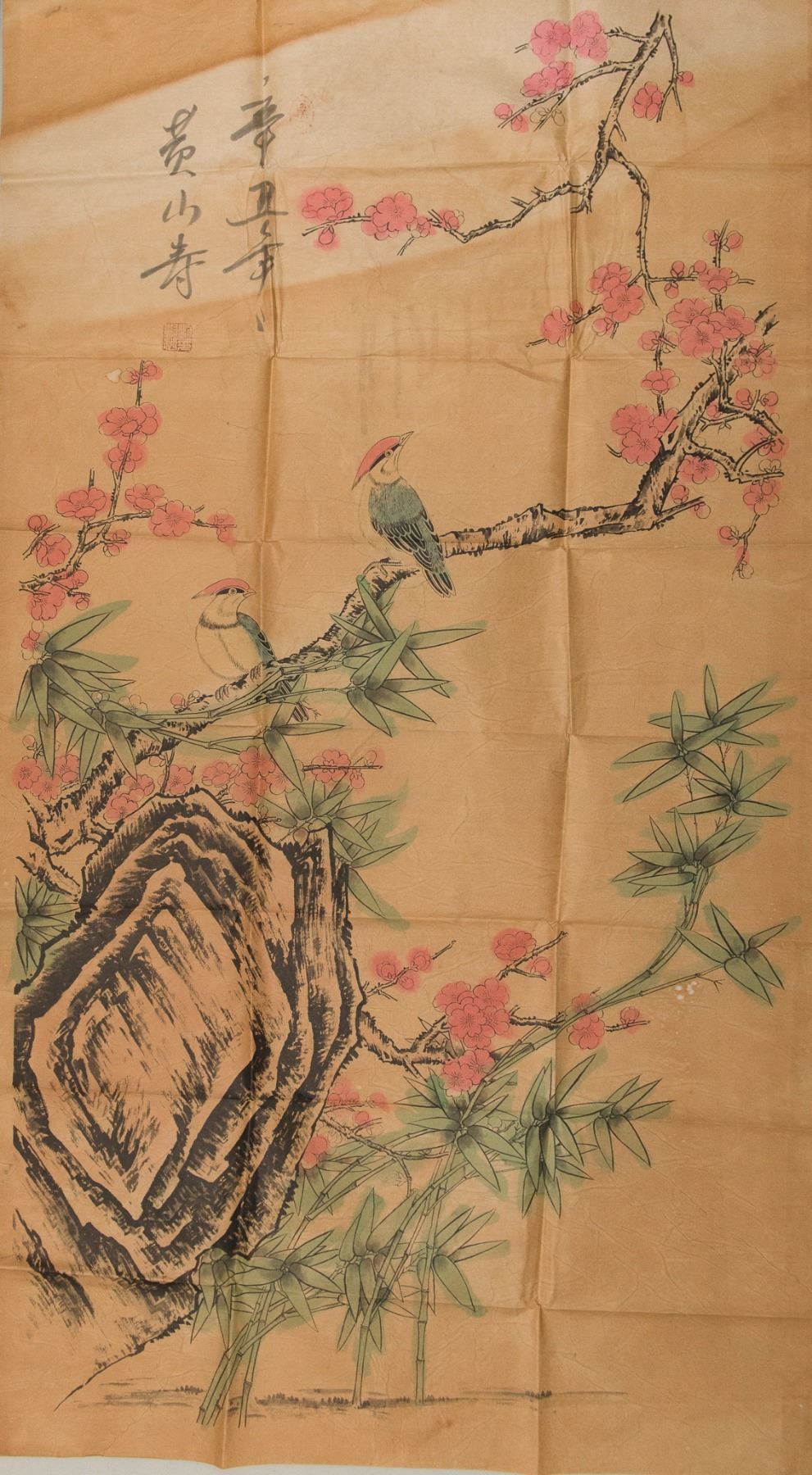 Songbirds on prunus branches, Chinese ink and watercolour on paper, signed Huang Shanshou with one red seal. 120 cm x 69 cm.