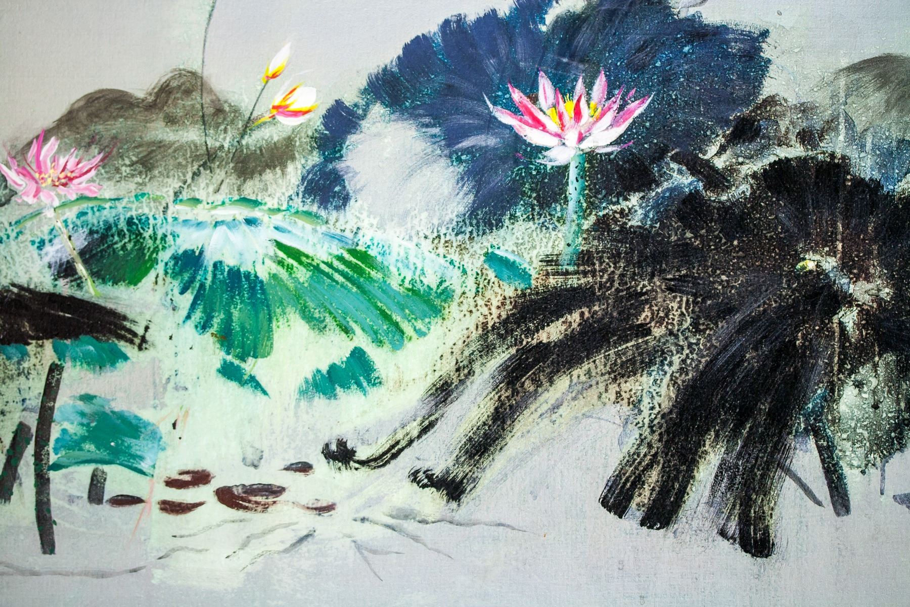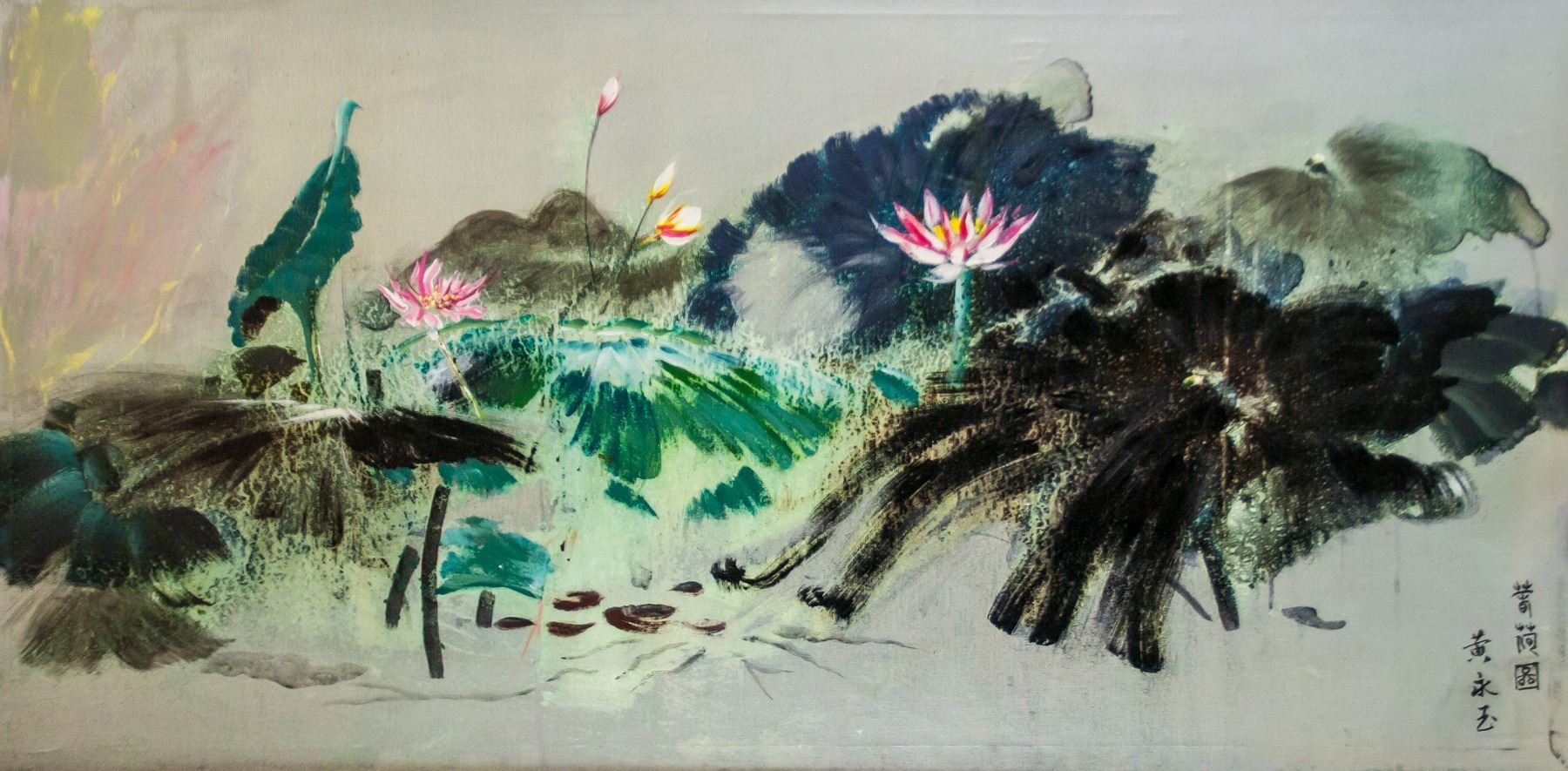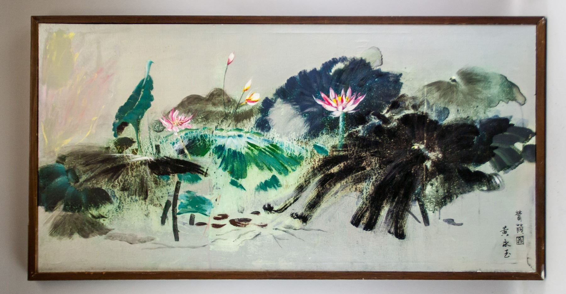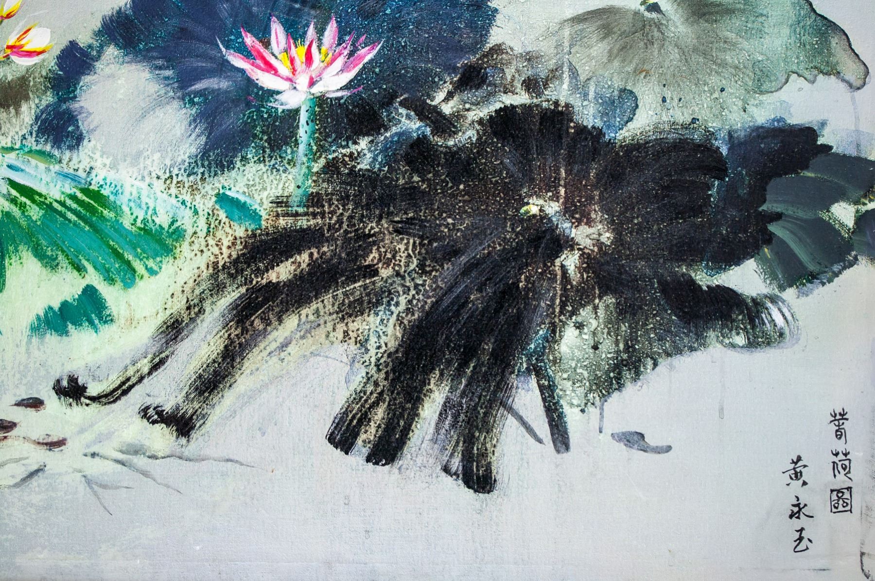 Oil on canvas, framed. Featuring lotus in pond. Signed Huang Yongyu on the lower right corner. 180 x 60 cm