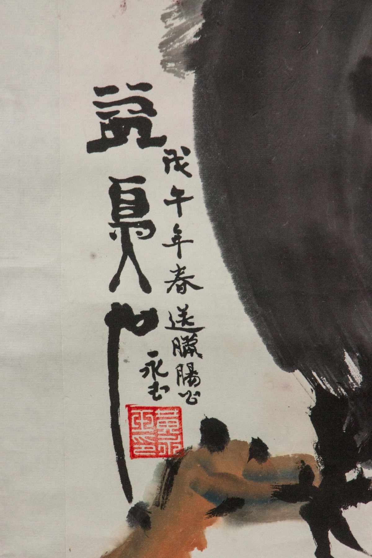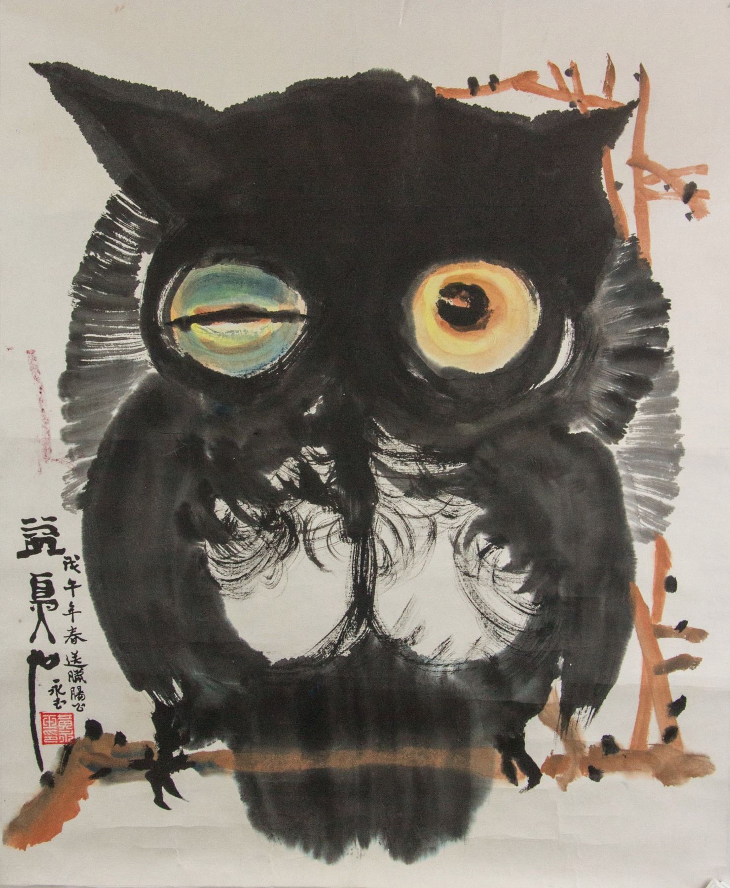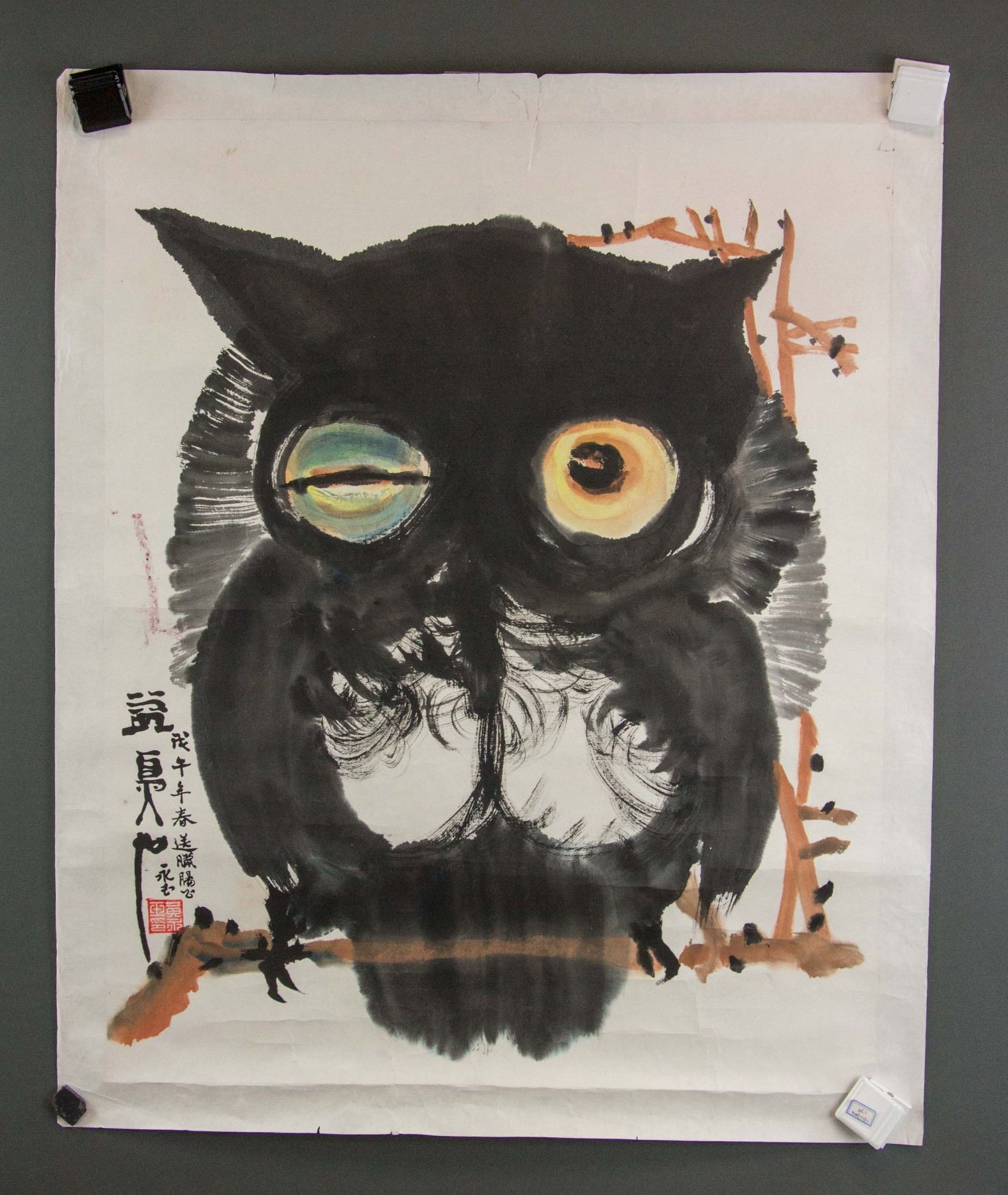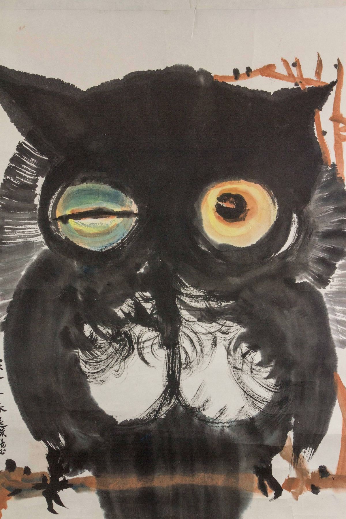 Painting of owl; Chinese ink and watercolour on paper roll; signed Huang Yongyu (b.1924); inscribed with 1 artist seal; 69 cm x 55 cm