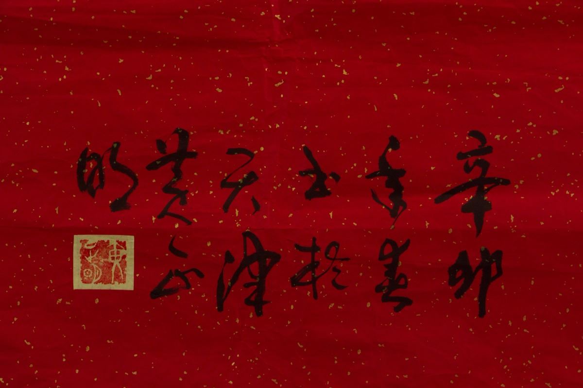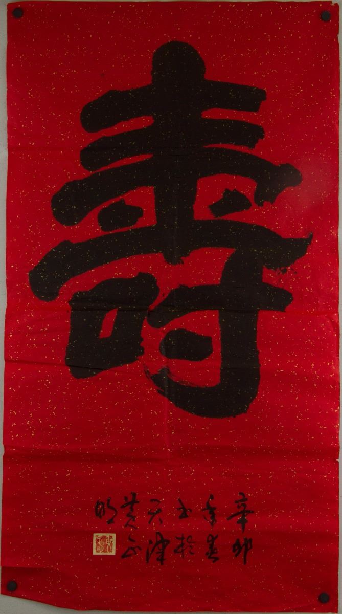 Chinese calligraphy; character "shou" meaning longevity; Chinese ink on red paper; signed Huang Zheng (b.1930); inscribed with 1 artist seal; 118 cm × 68 cm