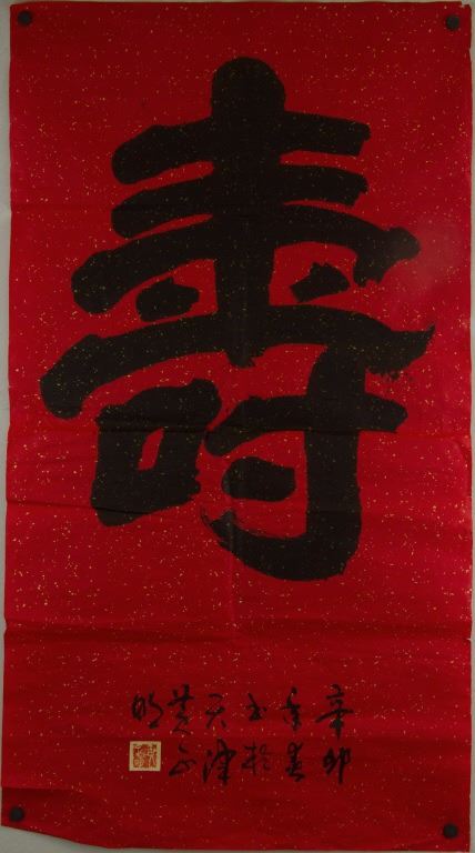 Chinese calligraphy; character "shou" meaning longevity; Chinese ink on red paper; signed Huang Zheng (b.1930); inscribed with 1 artist seal; 118 cm × 68 cm