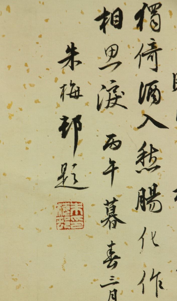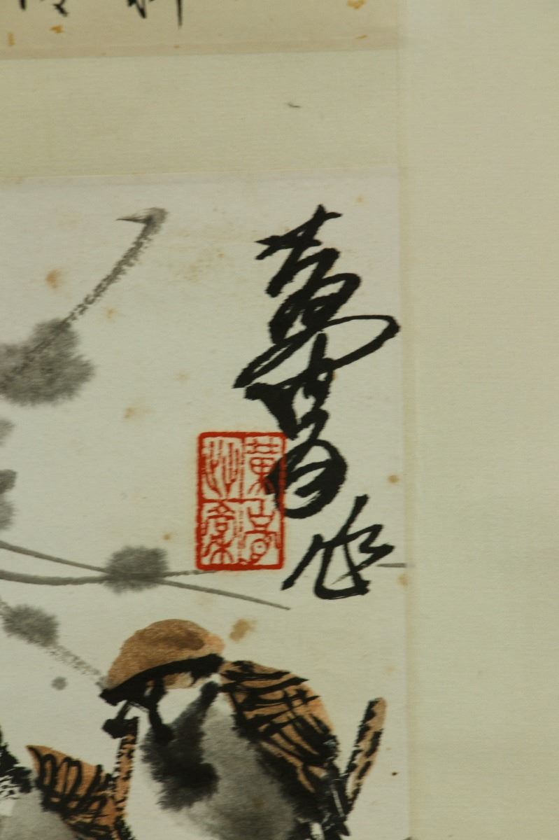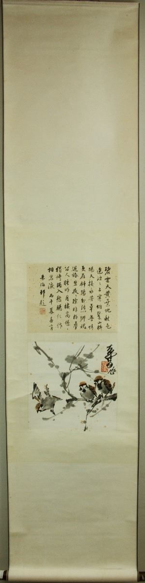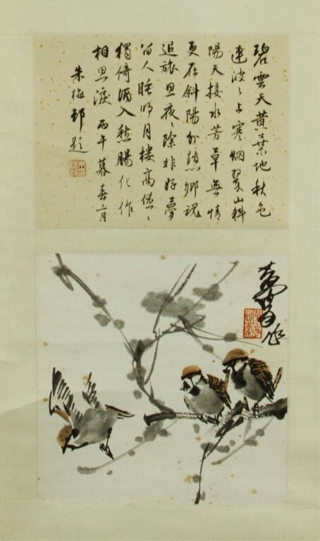 Birds perching on plum blossom branches along with calligraphy inscription; Chinese ink and watercolour on paper; hanging scroll; signed Huang Zhou and inscribed with one artist seal; 52 cm × 28 cm