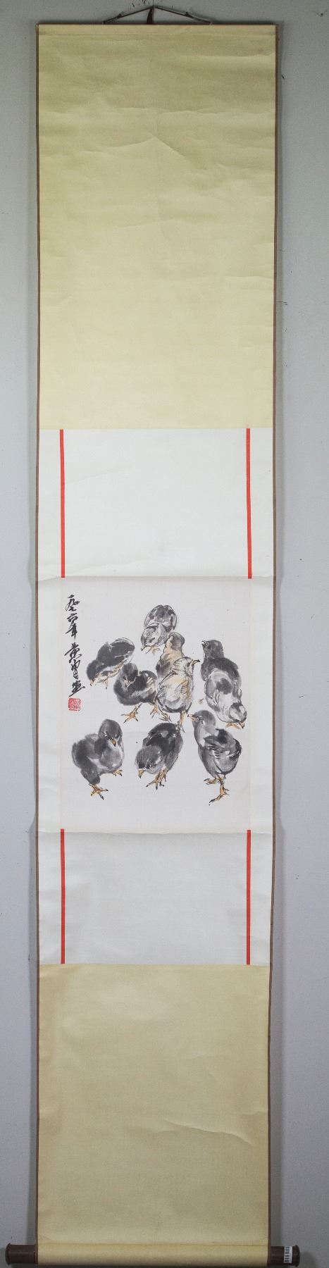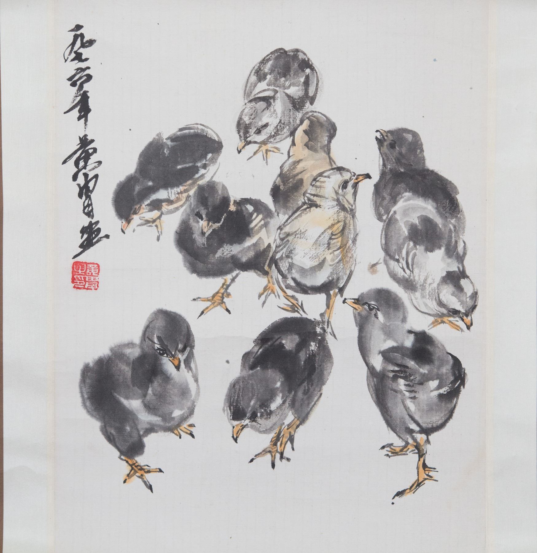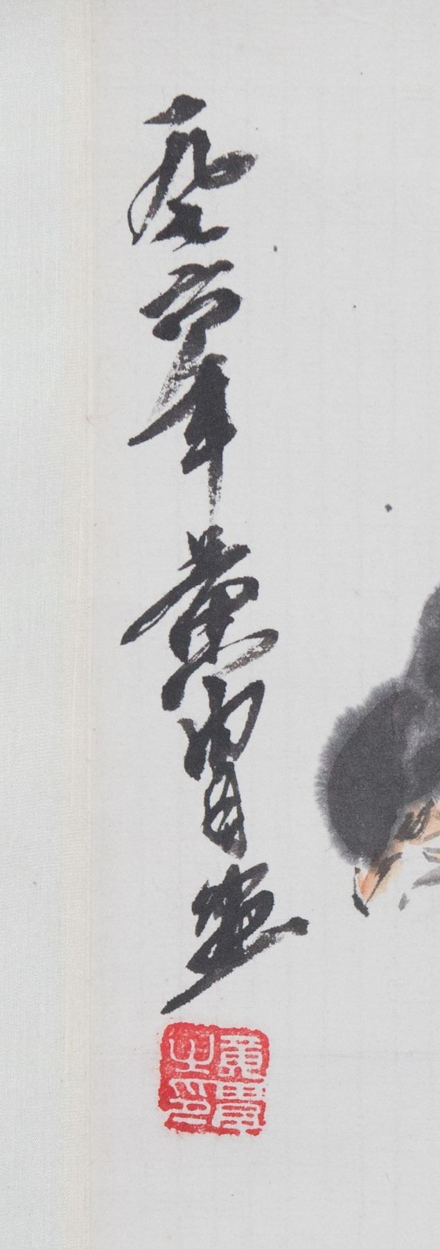 Chicken painting, hanging scroll; Chinese ink and watercolour on paper; signed Huang Zhou (1925-1997)