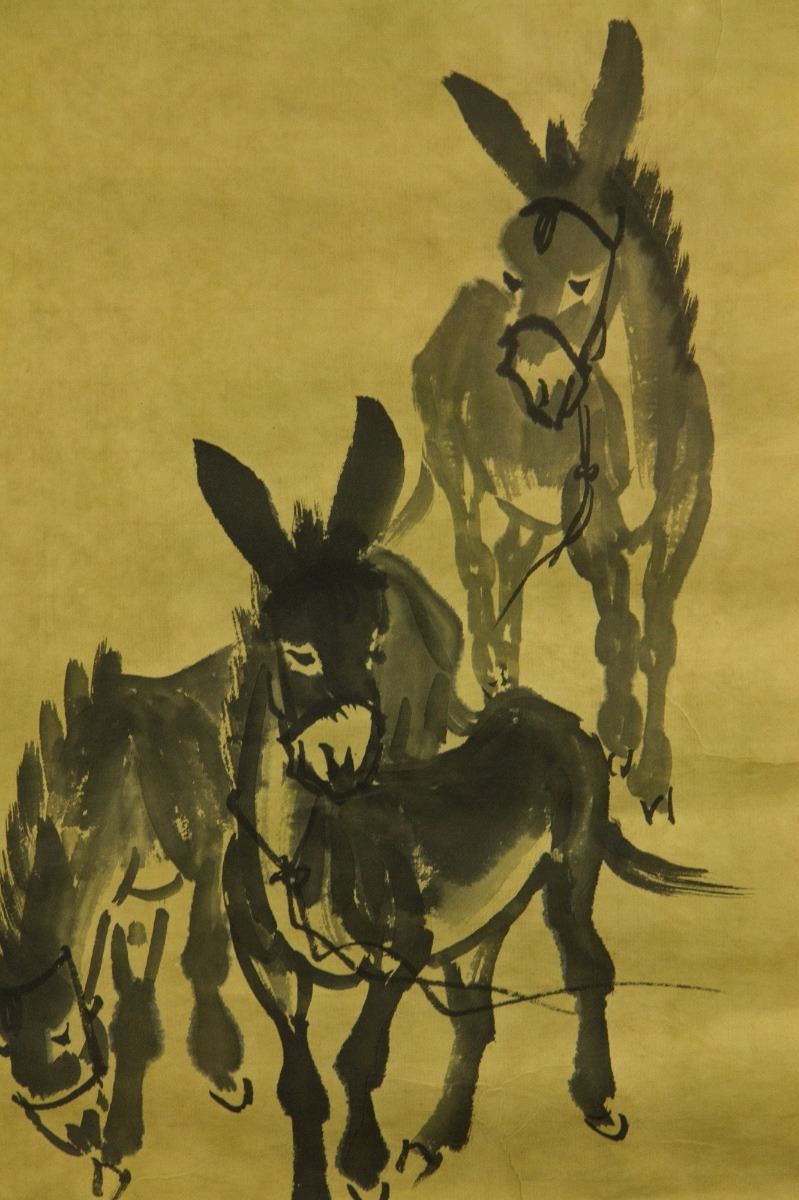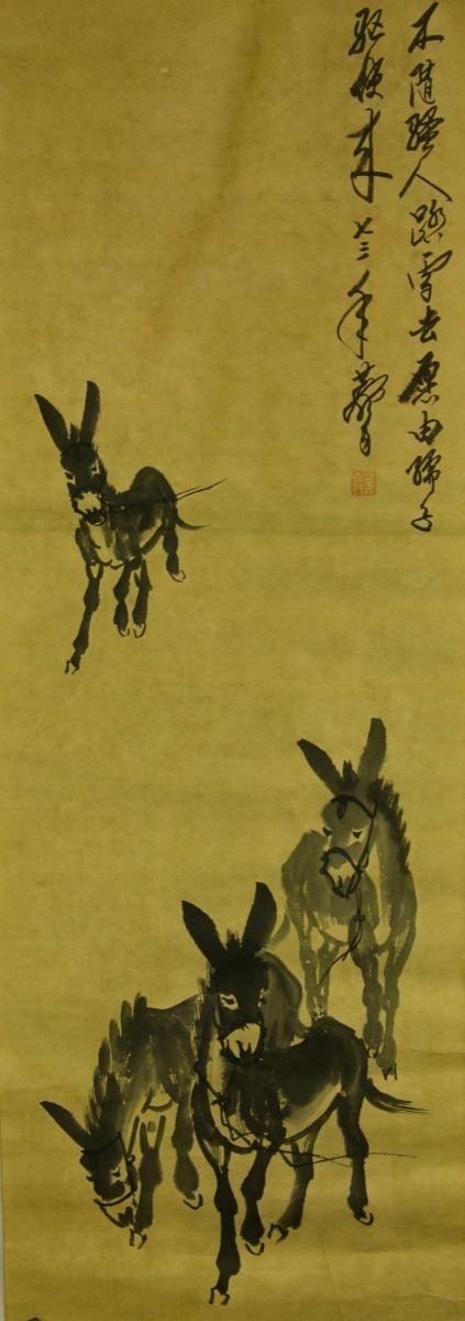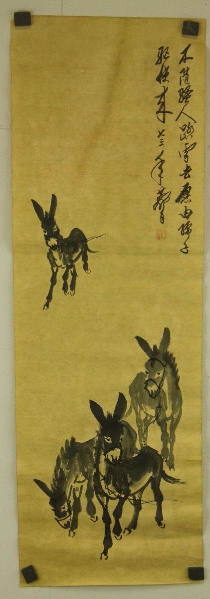 Donkeys; Chinese ink on paper scroll; signed Huang Zhou (1925-1997); inscribed with one artist seal; 90 cm × 30 cm