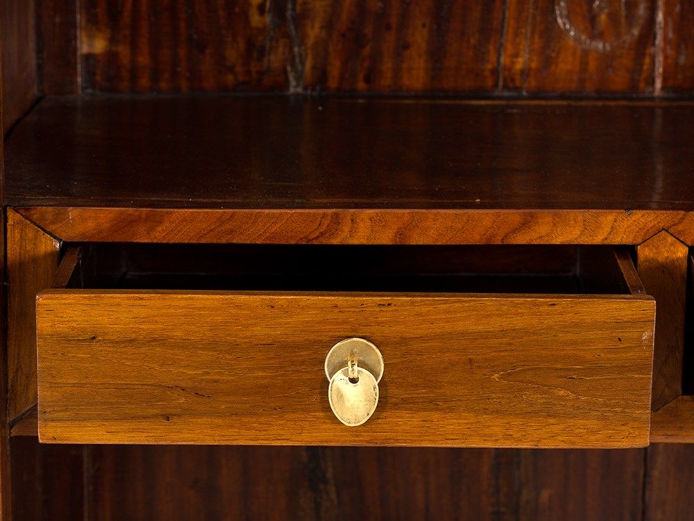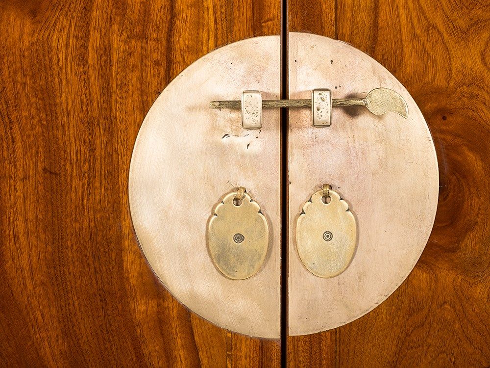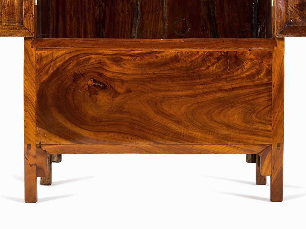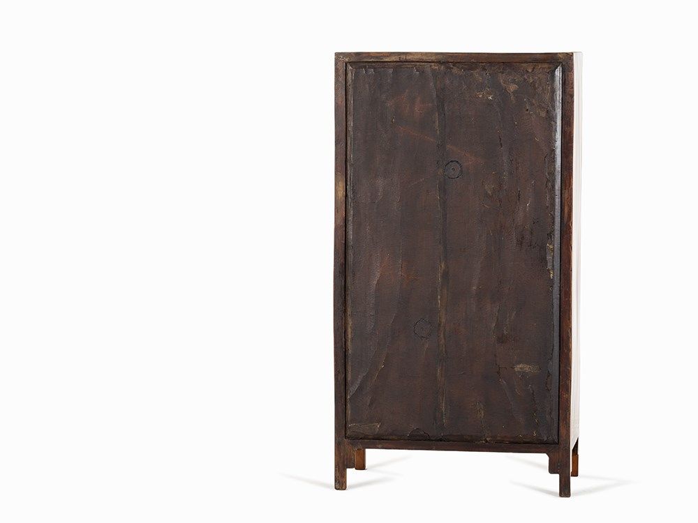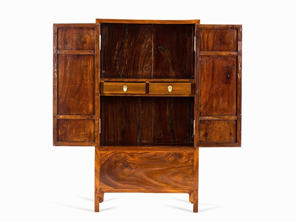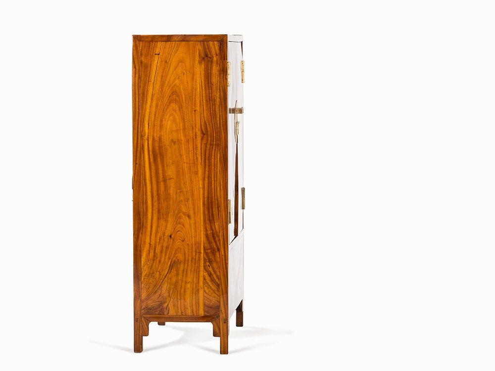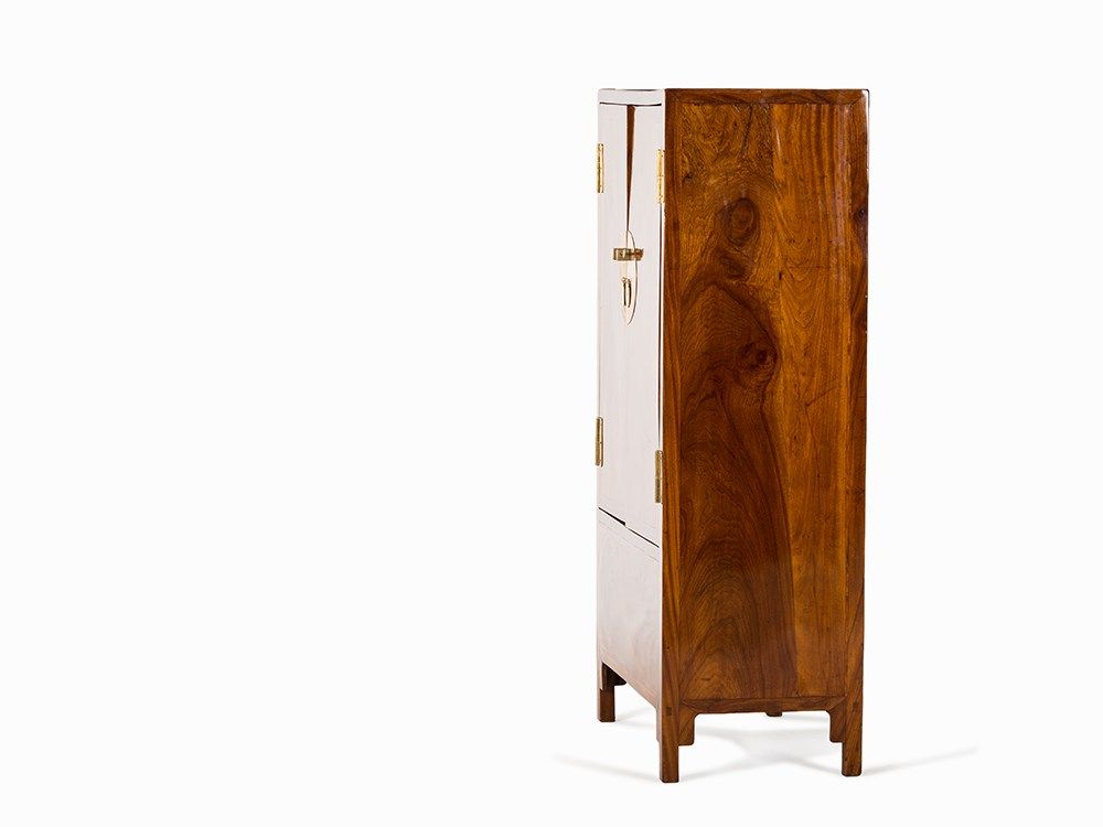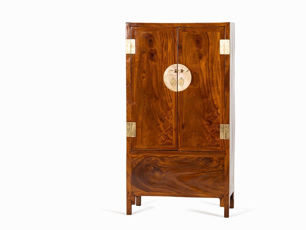 Known in Chinese as sijiangui (‘four-part wardrobes’) or dingxiang ligui (‘top cupboards and upright wardrobes’ these compound cabinets were generally made in pairs. The present piece comes without the top cabinet. Compare R. H. Ellsworth et al., Chinese Furniture: One Hundred Examples from the Mimi and Raymond Hung Collection, New York 1996, p. 188, no. 73 and Sarah Handler, Ming Furniture in the light of Chinese Architecture, New York 2005, p. 192.