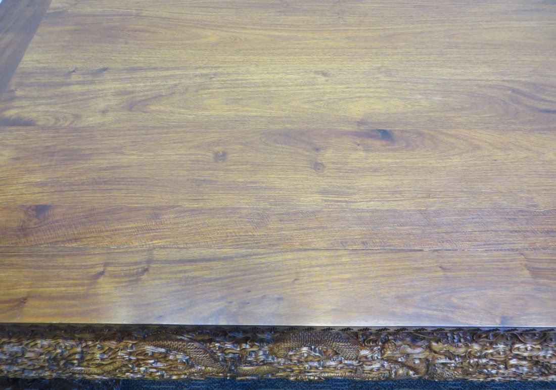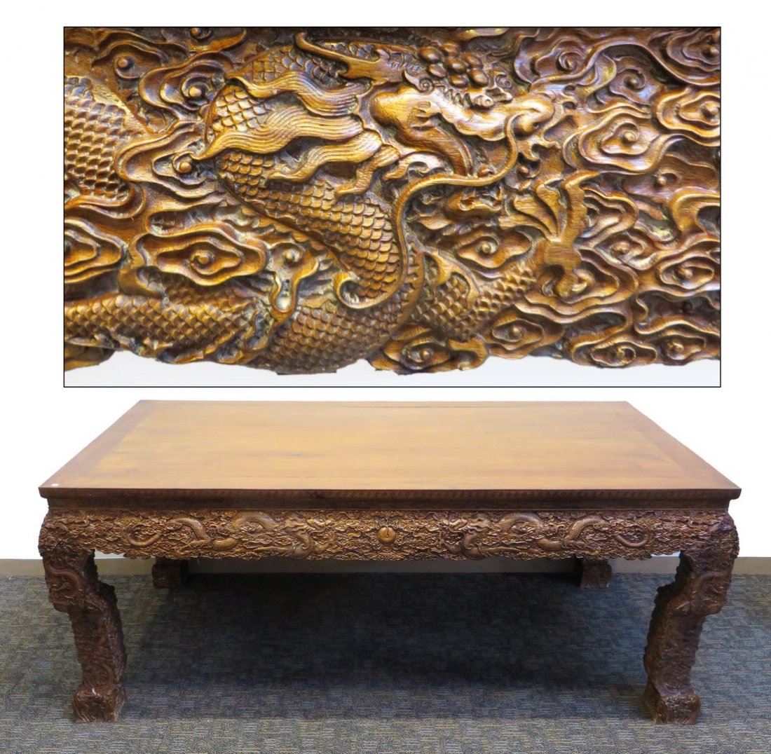 Elaborately carved in relief all over the sides and curvilinear legs with swirling, seething dragons amidst a complex array of clouds and flaming pearls. No reserve!