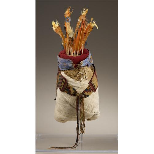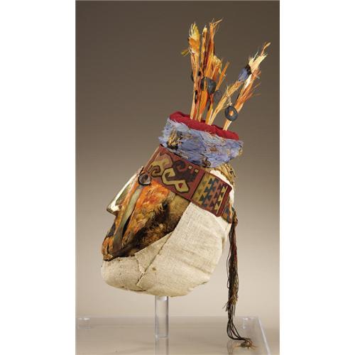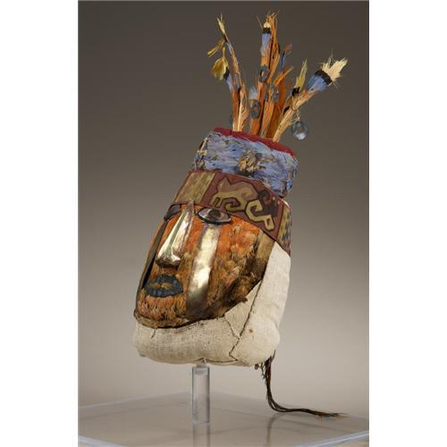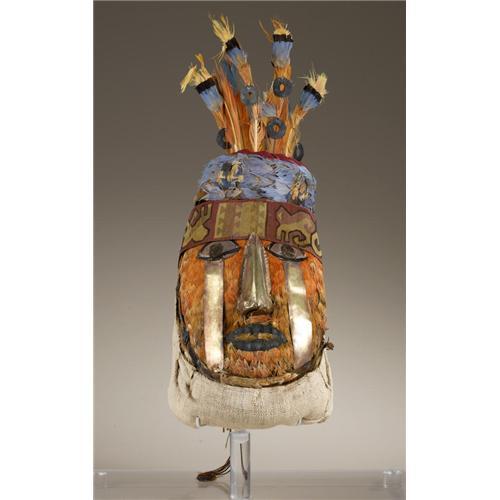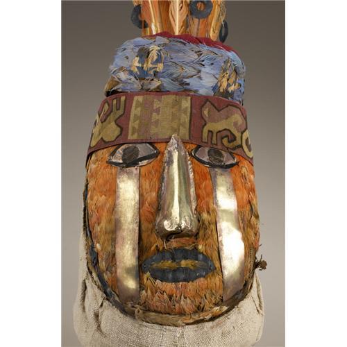<B>Stylized Portrait Head for Funerary Array</B></I><BR>Huari (possibly)<BR>A.D. 500 - 1000<BR>Gold, silver, cotton and camelid yarns, feathers, gourd<BR>Height 19 1/2 in. Width 8 in. Depth 10 1/2 in.<BR><BR>This is an example of a group of similar such elaborately constructed portrait heads for funerary bundles. All combine segments of feathers on cloth backings, gold and silver, and a variety of woven and plain textiles. The resulting effect is colorfully dramatic.<BR>The face is in orange-red macaw feathers overlaid by a silver-gilt nose in high relief, with flat eye and mouth panels and "tear" streamers flowing from the eyes to the edge of the chin, all in silver-gilt. The eyes are outlined in overlaid black feathers, and there are black feather pupils in red-painted areas representing the whites of the eyes. A horizontal red feather band separates upper and lower lips, behind which are six vertical black sewn bands with some remains of black feathers. A band of alternating blue and red feathers attached to cloth binds the edge of the face, with two silver cutwork circlets at the proper right side. The face is topped by a woven textile band into which hair has been threaded. Over this is laid a tapestry-weave band tied at the back of the head.<BR>The headdress is based on a gourd core around which is a red fabric roll (possibly modern) over which is bound a varicolored feather-on-fiber band. Ten circumference holes have been punctured around a central hole in the gourd. In these a central and seven circumference orange-red macaw tail feathers remain, all topped by tufts of blue and black feathers laid into salmon-colored feathers. Each of these vertical assemblages had two silver disks added, some of which remain.<BR>The present condition manifests expected feather loss and breakage. Some of the textiles are faded or stained. There is some stabilization and reattachment with modern whitet