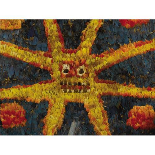 <B>Tunic Panel</B></I><BR>Huari<BR>A.D. 600 - 900<BR>Feathers sewn to cloth backing<BR>Height 24 3/4 in. Width 30 3/4 in.<BR><BR>This bold image formed either the front or back of a tunic. The loosely woven textile base is completely covered by the feather design, executed primarily in macaw and parrot feathers. The focal motif on the blue ground is a yellow, eight-rayed face with large staring eyes and bared teeth. Salmon-orange feathers outline this central "sun", frame the eyes, and suggest a tongue between the rows of teeth. Four squares in the same salmon-orange frame the rayed image, and two similarly colored rectangular tabs connect with the outer edges just above the half-way point. Other than a normal amount of feather loss, the condition is good.<BR><BR>Provenance<BR>Dr. Wally and Brenda Zollman Collection, Indianapolis<BR>Dylan Graeme Collection<BR>Butterfields, San Francisco: sale 7307E, 25 March 2002, lot 5075, p.24, ill. p.24<BR><BR>Publications<BR>José Antonio DeLavalle, <I>Arte y Tesoros del Peru.</B></I> Lima: Banco de Credito del Peru en la Cultura, 1984, #115 (illustrated).<BR>Edward H. Merrin and Linda Schildkraut. <I>Precolumbian Masterpieces: Mexico, Peru, Central America, American Indian.</B></I> New York: Edward H. Merrin, 1985, #26 (illustrated).<BR>Lee A. Parsons, John B. Carlson & Peter David Joralemon, <I>The Face of Ancient America,</B></I> Indianapolis: Indianapolis Museum of Art, 1988, pp.216-217, #153 (illustrated).<BR><BR> <BR><BR><B>Import