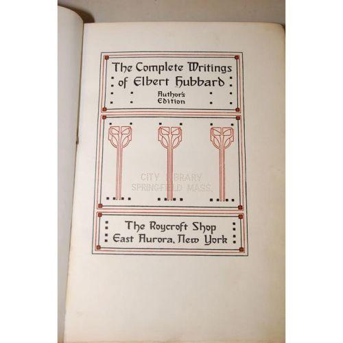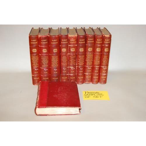 Hubbard, Elbert. The Complete Writings of Elbert Hubbard - Author's Edition - 19 (of 20) Volumes. East Aurora, New York: The Roycroft Shop, 4to - over 9¾" - 12" tall. Hard Cover. Ex-Library. Good Condition. 1908-1915. LIMITED - #246 OF 1000 SETS, EACH VOLUME SIGNED BY THE AUTHOR ON THE LIMITATION PAGE. Bound in original 1/2 red leather & cloth, raised bands on spines, top edges gilt, tissue guarded plates throughout, binding & hinges tight. Covers show edge/corner wear, occasional light marginalia in pencil, light damp mark on a few pages in 2 volumes, lacks vol. 16, lacks the 2 manuscript pages in vol. 1.