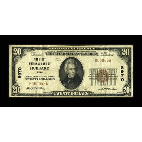 <B>Hubbard, IA</B></I> - $20 1929 Ty. 1 <B>The First NB</B></I> Ch. # 8970<BR> This is one of only 12 Series 1929 notes documented from here in all types and denominations. The strong embossing is noticed immediately. <B>Very Fine</B></I>.<BR><BR><b>Shipping:</b> Coins & Currency (<a target="_blank" href="http://www.heritageauctions.com/common/shipping.php">view shipping information</a>)