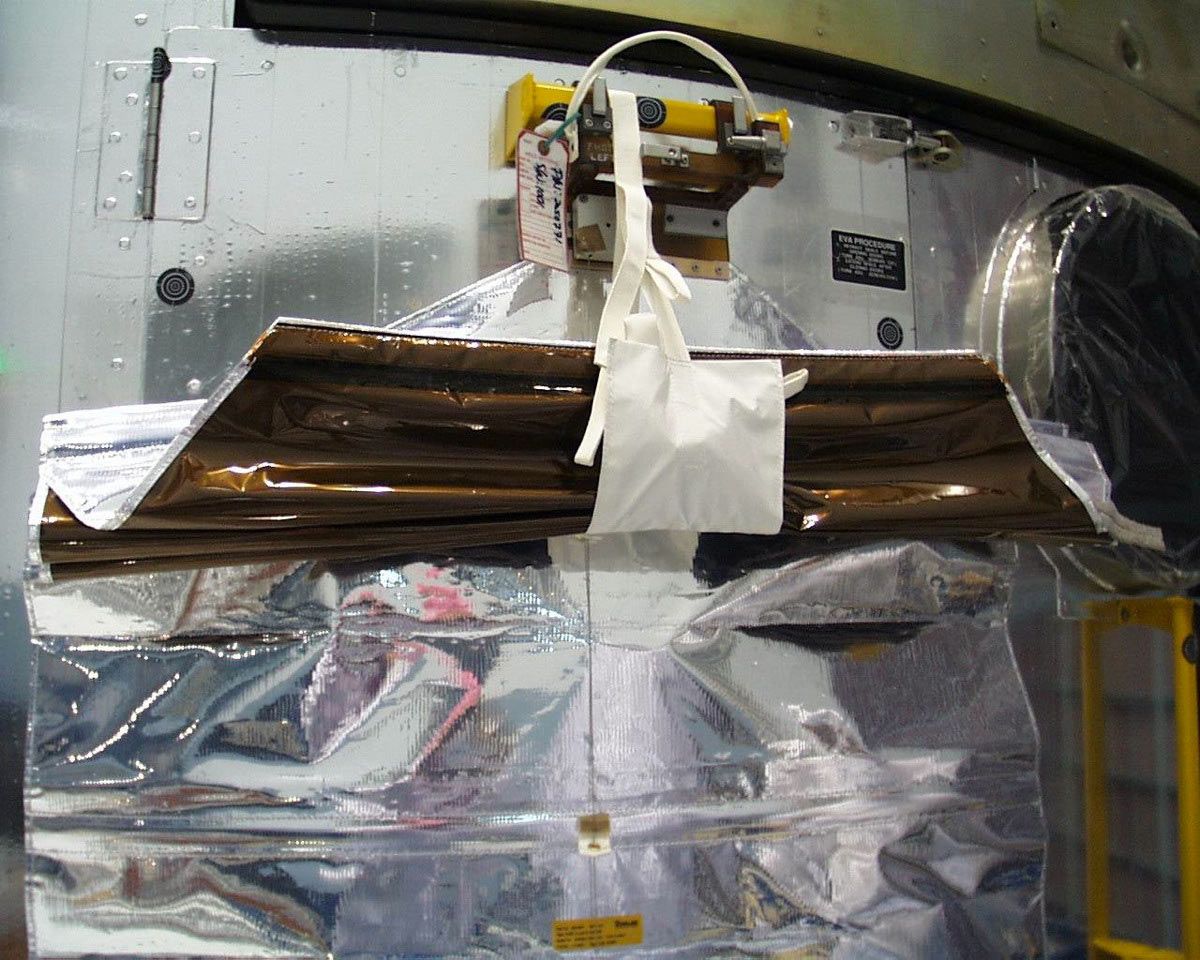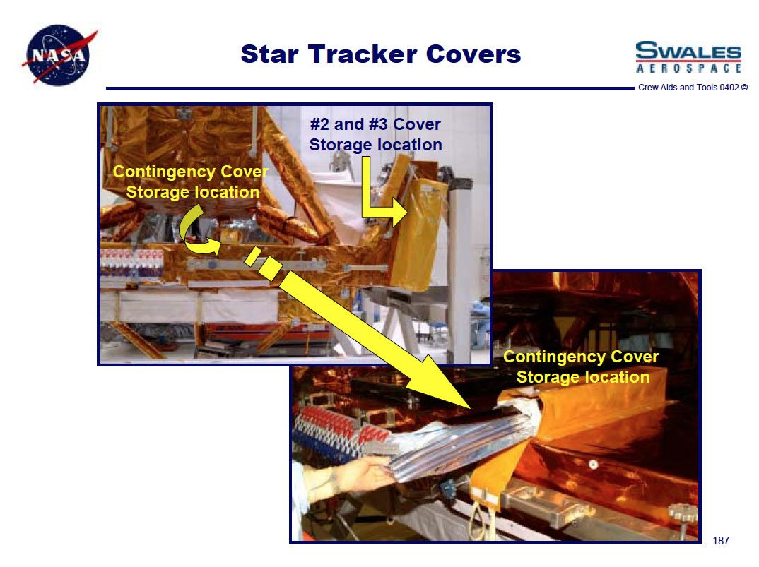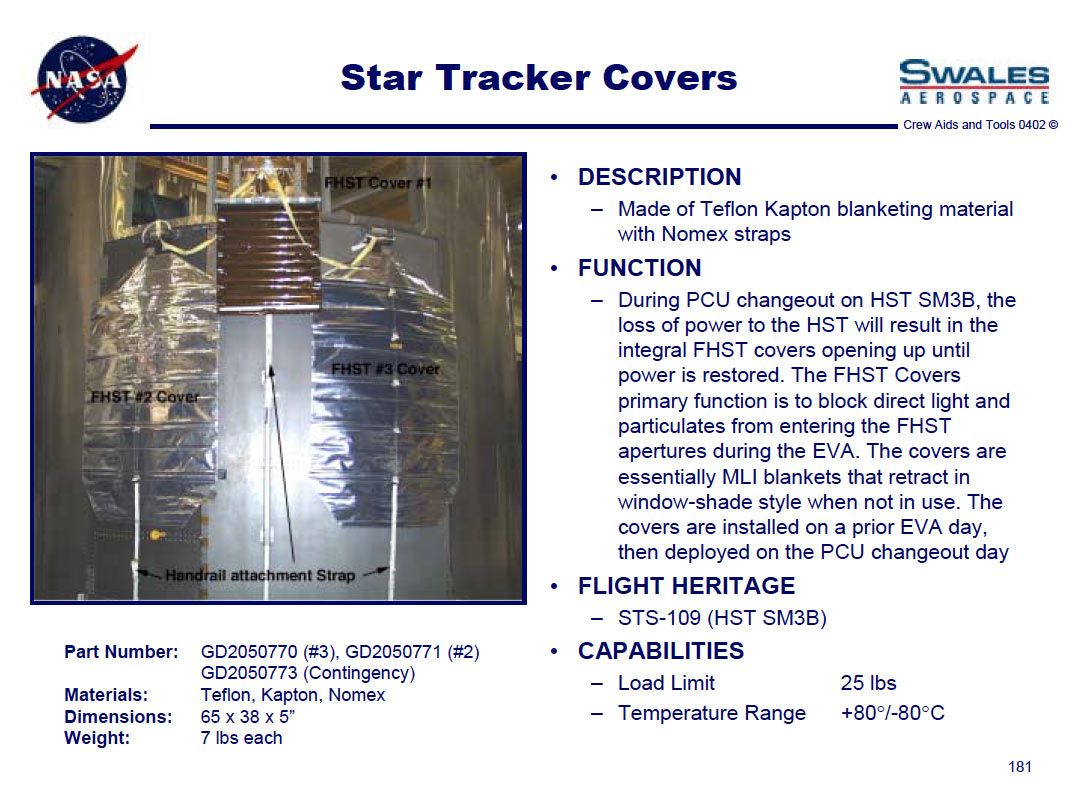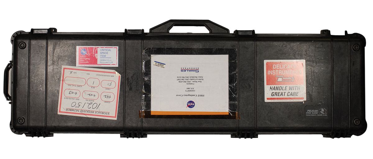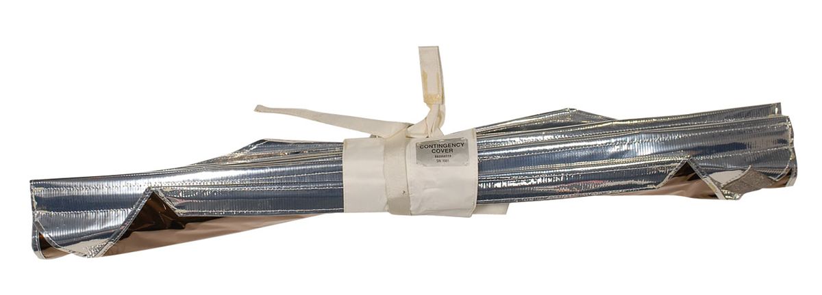 Flown Fixed Head Star Tracker (FHST) Contingency cover, SN #1001, flown on board Columbia mission STS-109 (SM3B). Made of Teflon Kapton blanketing material with Nomex straps, and measures 65 x 38 x 5 unfolded. Carried with two other covers, this was the contingency cover to be used only if needed, The function of the covers was to block direct sunlight and particulates from entering the Fixed Head Star Tracker during the PCU changeout on the Hubble. The covers were essentially blankets that retract in window-shade style when not in use, and would be installed on a prior spacewalk during the mission and deployed on the PCU change out day. Cover comes in its original Goddard Space Flight Center shipping case which was sent to the Kennedy Space Center during flight preparations for a Hubble service mission. In fine condition. Cover is listed in Swales Aerospace Crew Aids and Tools catalog. Flown Hubble Space Telescope astronaut crew aids and tools have never before been offered.