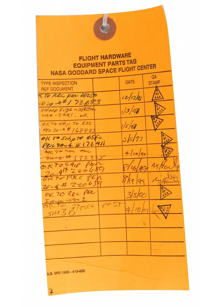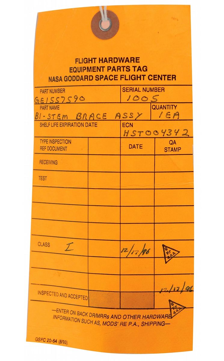 Flown Solar Array Bistem Brace, SN 1005, prepared for use on the Hubble Space Telescope. The brace is constructed of aluminum and stainless steel comprised of three telescoping tubes with solar array interfaces at both ends of the tool and measures 112? long. The Bistem Braces (three telescoping tubes with solar array interfaces at both ends of the tool) were designed to provide (on orbit) structural support in the event of a bent or distorted HST Solar Array II. Serial Numbers 1001-1008 flew on STS-82 (Hubble Space Telescope Servicing Mission 2 (HST SM2) aboard the space shuttle, Discovery, in February 1997. They were located on the underside of the Second Axial Carrier (SAC). Serial Numbers 1001-1008 flew a second time aboard Discovery for the STS-103 (HST SM3A) mission in December 1999 and were mounted on the Orbital Replacement Unit Carrier (ORUC). Finally, Serial Numbers 1001-1004 flew on STS-109 (HST SM3B) aboard Columbia in March 2002. These were mounted on the Rigid Array Carrier (RAC). None of the Bistem Braces were ever needed during the three mission EVAs. In fine condition. Swales Aerospace made a total of only nine Solar Array Bistem Brace tools ever, per NASA contract, for the Hubble program office at Goddard Space Flight Center, MD. Originates from Stafford’s personal collection. Please note that all proceeds from the sale of this brace go towards raising funds for the building of 1:1 scale X-1 model at the Stafford Air and Space Museum. A large and important contingency piece for the Hubble, exposed three times to the rigors of space.