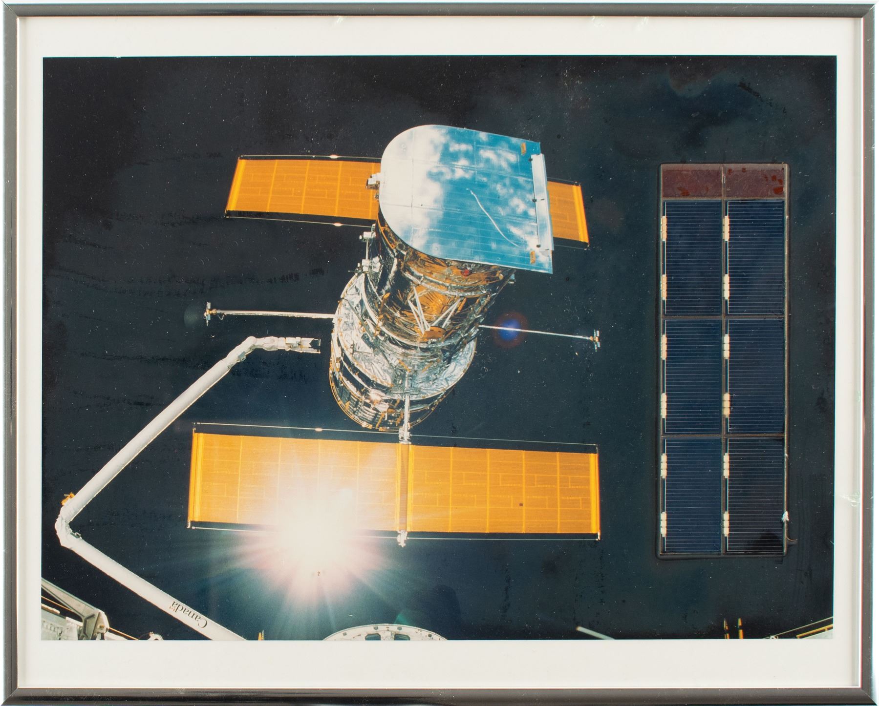 A 1.75˝ x 5.25˝ segment of solar cells as used on the Hubble Space Telescope, affixed to an 11.5˝ x 9˝ mount depicting the telescope with its solar arrays deployed. Framed and in fine condition, with light rippling to the photo mount. The consignor notes that this was acquired from the estate of a former ESA engineer who worked on the development of the Hubble's solar array.