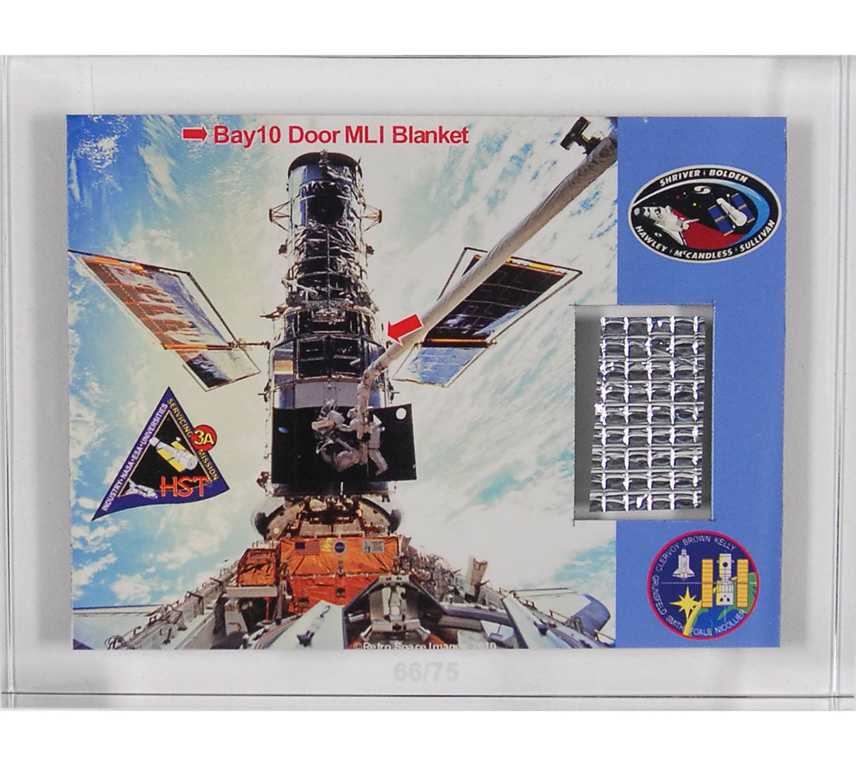 Flown limited edition Hubble Space Telescope polymide film,numbered 66/75, retrieved during a 1999 shuttle mission. Film measures .75 x 1 and is encased in a 4.5 x 3.5 piece of Lucite against a color informational photo display, with the reverse bearing an image of the Hubble with an arrow pointing to where the material was removed. Information reads, “This aluminized polymide film is from an original multi-layer insulation (MLI) blanket covering the exterior of the Hubble Space Telescope. It was removed on December 24, 1999, from the Support System Module’s Bay 10 door during Servicing Mission 3A by STS-103 astronauts Steven Smith and John Grunsfeld. This material flew on-orbit more than 1.5 billion miles from the April 24, 1990, launch of STS-31 (Hubble deployment) to the STS-103 landing on December 27, 1999.” In fine condition.