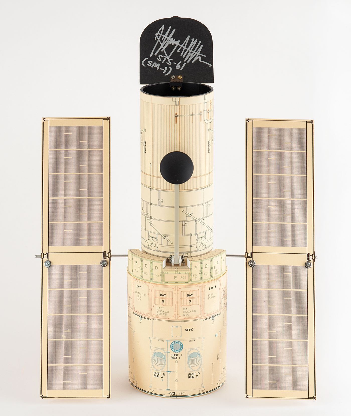 Extremely rare NASA first generation paper model of the Hubble Space Telescope, standing approximately 13? in height and 12? wide with extended solar array panels, signed on the underside of the upper lid in silver ink, “Jeffrey Hoffman, STS-61, (SM-1).” The carefully detailed model, with articulating high gain antennae, has every panel and bay labeled for easy reference. This working model originates from the Hubble Program Office at the Goddard Space Flight Center and was used as a reference by NASA engineers and Mission Control personnel in the event of any unforeseen issues. In fine condition, with light overall staining from exposure to cigarette smoke. Models such as this one can be viewed in various NASA documentaries pertaining to the earlier Hubble Service Missions. A handsomely rendered working NASA model that falls into the ‘endangered’ category—a remote handful of these models have survived over the years, with this example all the more desirable for its superb condition.