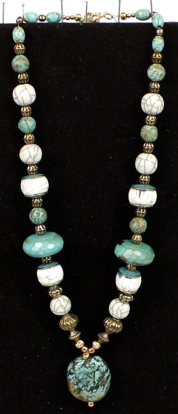 Quail Ridge Studios Hubei Chinese Turquoise & Bone Bead Necklace by Larry McLellan of Silver City NM, measures 23"L end to end, largest bead measures 1 3/8"D, accented with goldtone spacer beads, lovely combination of colors in the gorgeous necklace