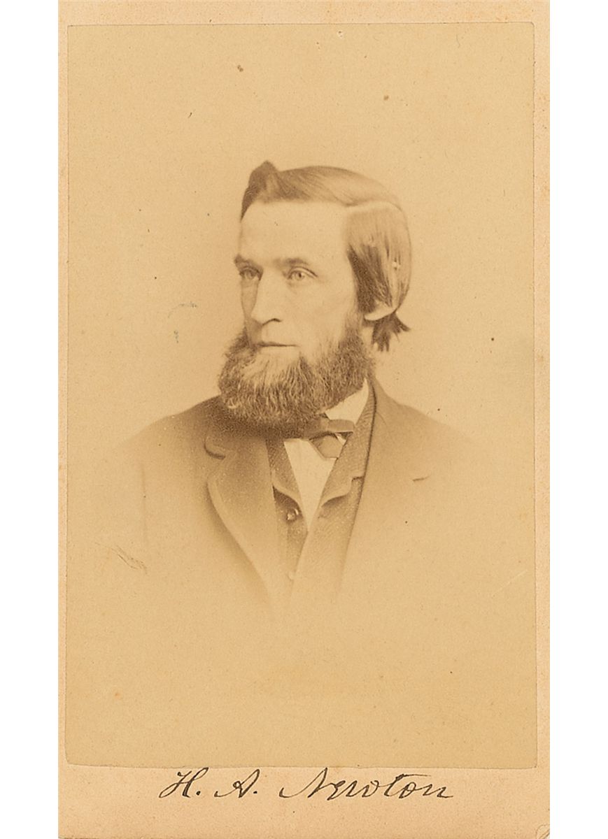 Mathematician and astronomer (1830–1896) noted for his research on meteors. Original 2.25 x 4 carte-de-visite photo by Sarony of New York, signed in the lower border in black ink, “H. A. Newton.” In fine condition, with a couple trivial surface impressions to top edge.