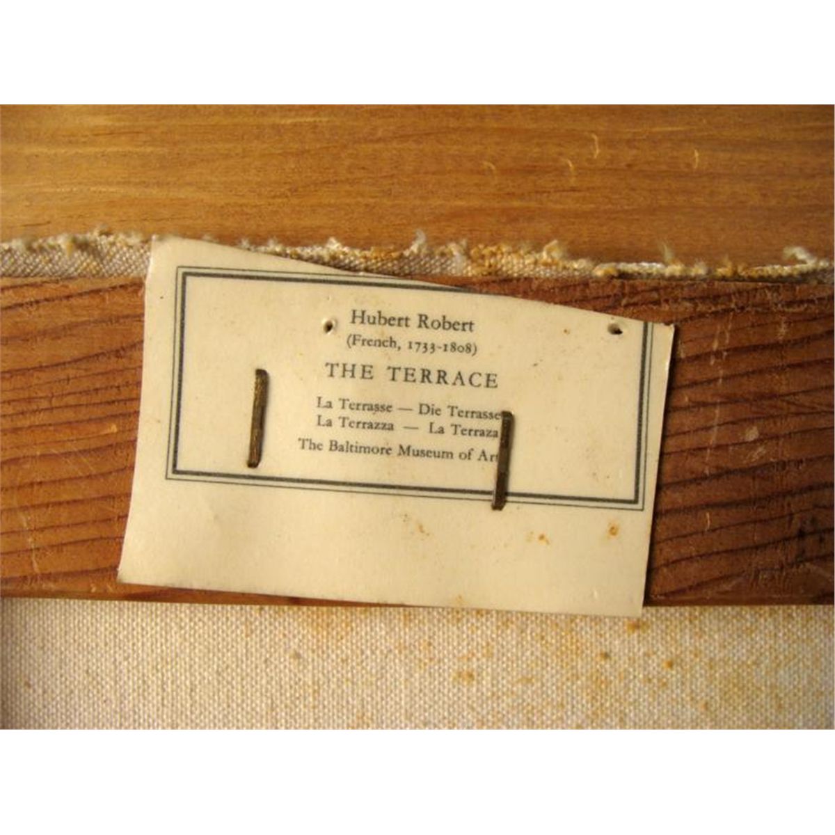 This is a high quality canvas reproduction print of a beloved painting by Hubert Robert. The scene portrays a splendid terrace amidst tall trees, with families enjoying the outdoors. * Artist: Hubert RobertTitle: "The Terrace" Medium: Print on canvasImage size: 9 1/2 x 13 1/2 inchesEdition: From The Baltimore Museum of Art -from label on backFraming: In gold tinted wood frame with yellow velvet matting and inner wooden matteFrame size: 16 x 20 inchesCondition: Excellent *