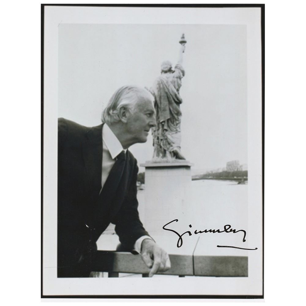 Glossy 7 x 9.25 photo of Givenchy at the Pont de Grenelle in Paris, signed in black felt tip, "Givenchy." In fine condition, with a slightly blurry quality to the image.
