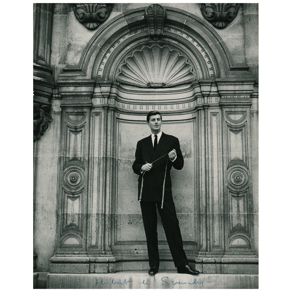 French fashion designer (1927–2018) who founded the House of Givenchy in 1952, famous for designing clothes for the likes of Audrey Hepburn and Jacqueline Kennedy. Handsome glossy 8 x 10 photo of Givenchy holding a measuring tape in a classic architectural alcove, signed at the bottom in blue ballpoint. In fine condition. Accompanied by a transmittal letter from his secretary, dated March 30, 1955. An absolutely impeccable image of the groundbreaking designer.