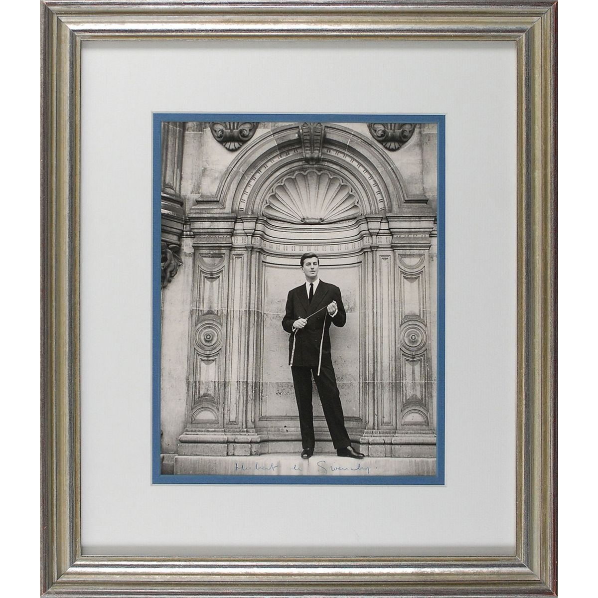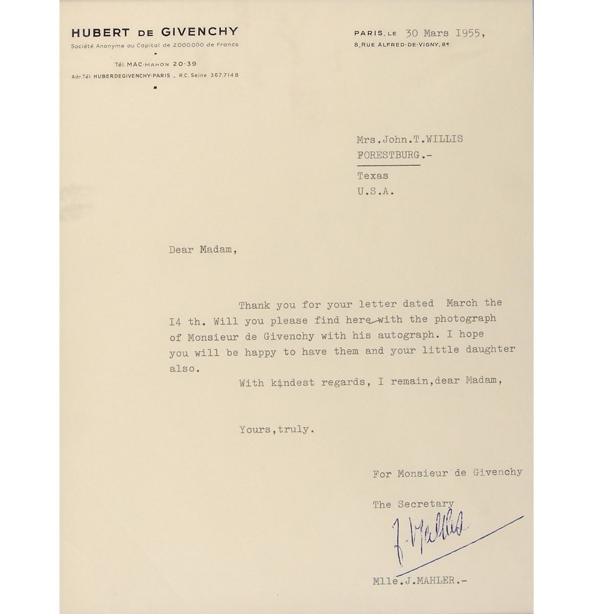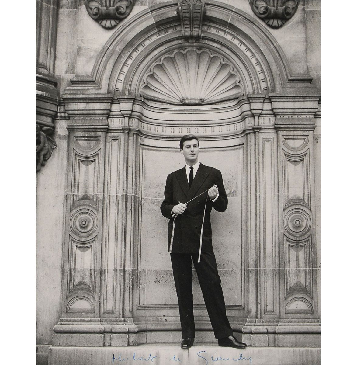 French fashion designer (born 1927) who founded the House of Givenchy in 1952, famous for designing clothes for the likes of Audrey Hepburn and Jacqueline Kennedy. Handsome glossy 8 x 10 photo of Givenchy holding a measuring tape in a classic architectural alcove, signed at the bottom in blue ballpoint. Expertly double-matted and framed to an overall size of 14.5 x 17; the frame has a window in the backing so that the secretarial transmittal letter, dated 1955, can be viewed. In fine condition. An absolutely impeccable image of the groundbreaking designer, and the first Givenchy we have offered.