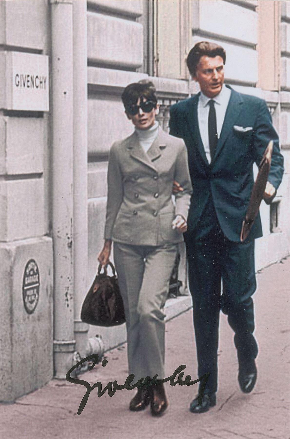 French fashion designer (1927-2018) who founded the House of Givenchy in 1952, famous for designing clothes for the likes of Audrey Hepburn and Jacqueline Kennedy. Color glossy 4 x 6 full-length photo of Hubert de Givenchy walking the streets of Paris with actress Audrey Hepburn, signed in black felt tip, "Givenchy." In very fine condition.