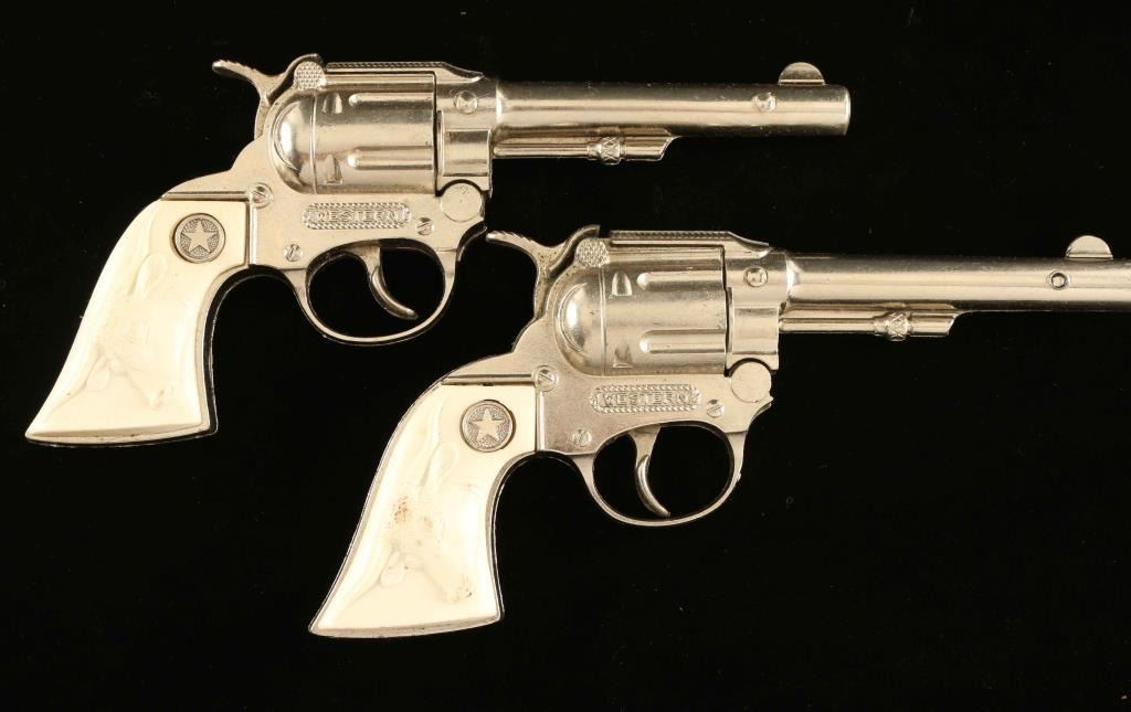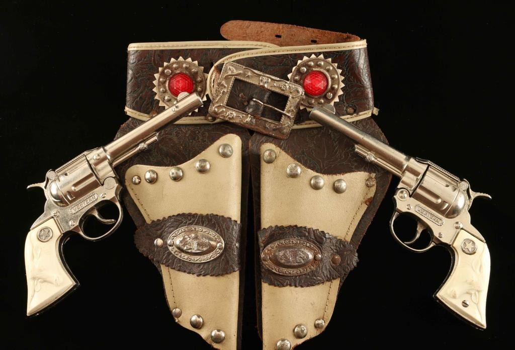 Hubley marked cap guns with red star and faux ivory grips with molded Texas longhorn steer. Holsters are Tooled brown leather with tan suede pockets with silver tack and horse head conchos. Belt is the same brown tooled leather with large silver buckle and round conchos with bead and faux gem design and bullet loops on back.