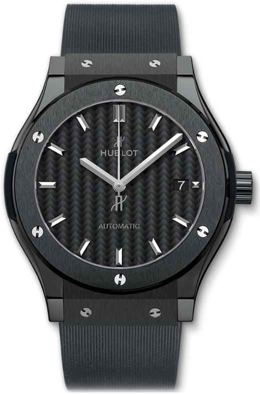 Model: 542.CM.1771.RX - CASE = [Material:Polished Black Ceramic], [Case Diameter:42], [Bezel:Fixed], [Case Back:Skeleton], [Water Resistant:50 Meters - 165 Feet], [Crystal:Scratch Resistant Sapphire], DIAL = [Color:Matte Black Carbon Fiber with Silver Hands and Hour Markers], MOVEMENT = [Type:Automatic], [Crown:Push In], BAND = [Clasp:Folding], [Type:Black Rubber], (In Stock - Ready to ship.)