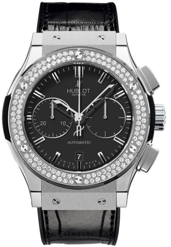 Model: 521.NX.1170.LR.1104 - CASE = [Material:Titanium], [Case Diameter:45], [Bezel:Fixed with Diamonds], [Case Back:Skeleton], [Water Resistant:50 Meters - 150 Feet], [Crystal:Scratch Resistant Sapphire], DIAL = [Color:Black], MOVEMENT = [Type:Automatic Chronograph], [Crown:Push In], BAND = [Clasp:Folding], [Type:Black Alligator Leather], (Usually ships in 1 to 2 weeks.)