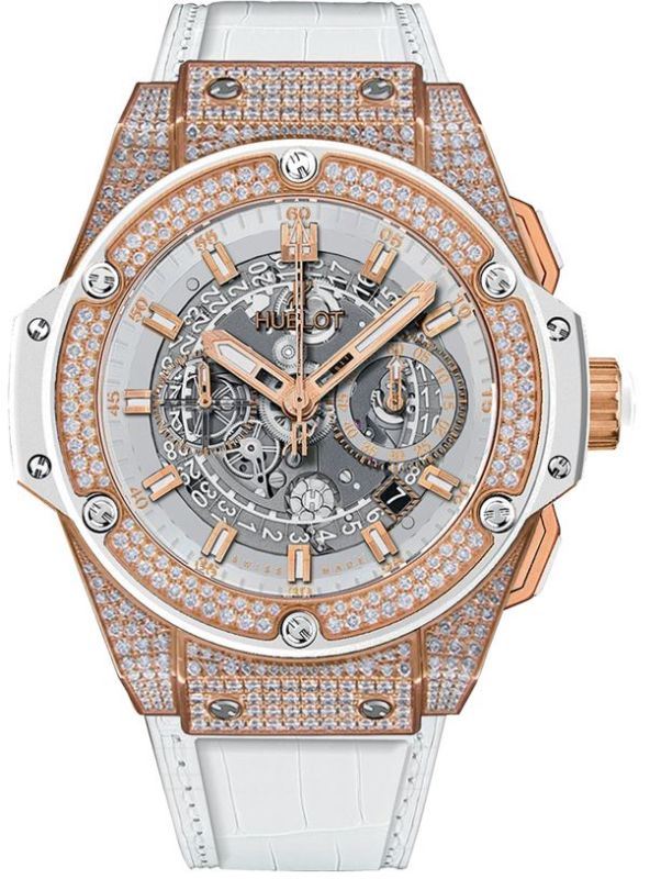 Model: 701.OE.0128.GR.1704 - CASE = [Material:Satin-finished 18K Rose Gold Set with 248 Diamonds for 1.97cts], [Case Diameter:48], [Bezel:Fixed, Satin-finished 18K Rose Gold and White Rubber Set with 126 Diamonds for 1.21cts], [Case Back:Skeleton], [Water Resistant:100 Meters - 330 Feet], [Crystal:Scratch Resistant Sapphire], DIAL = [Color:Skeleton], MOVEMENT = [Type:Self-winding Automatic Chronograph Flyback Movement with Column Wheel, 72 Hour Power Reserve], [Crown:Push In], BAND = [Clasp:Deployment], [Type:White Leather], (Usually ships in 1 to 2 weeks.)