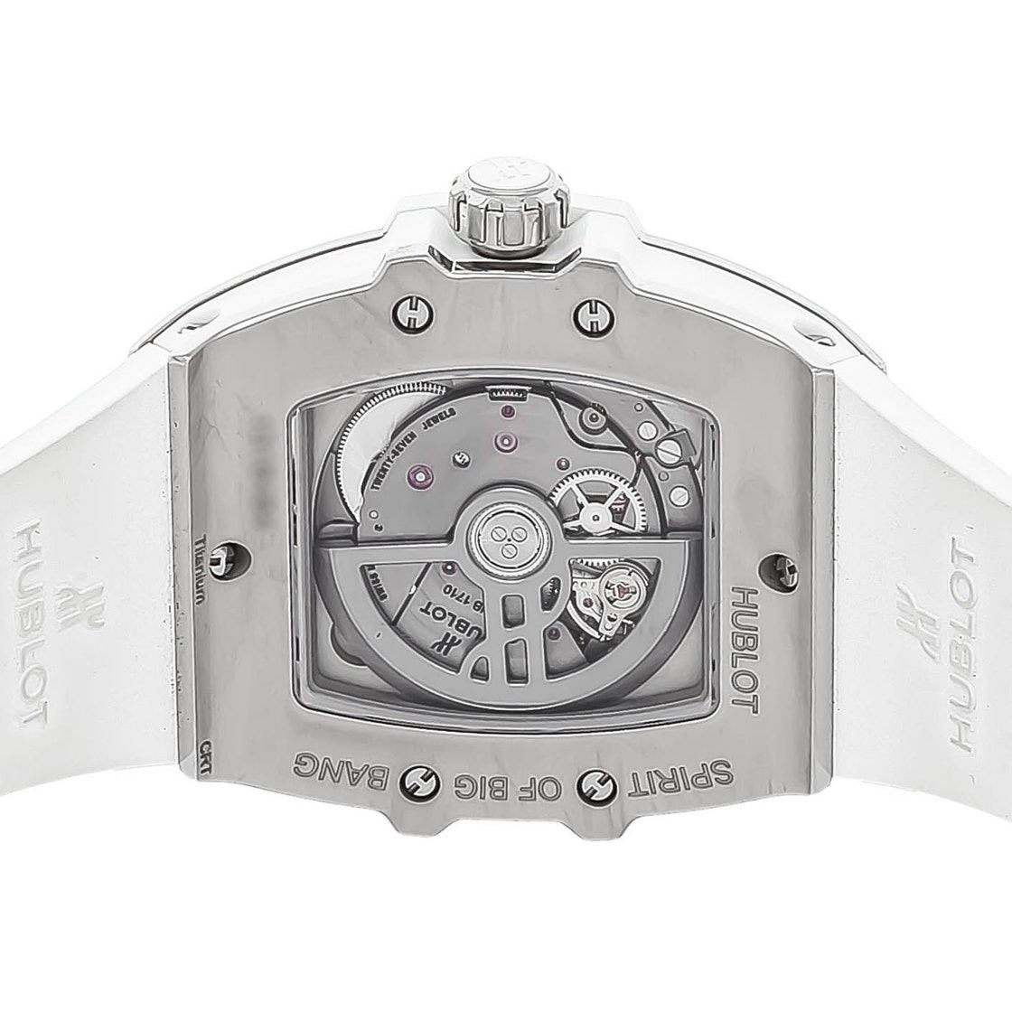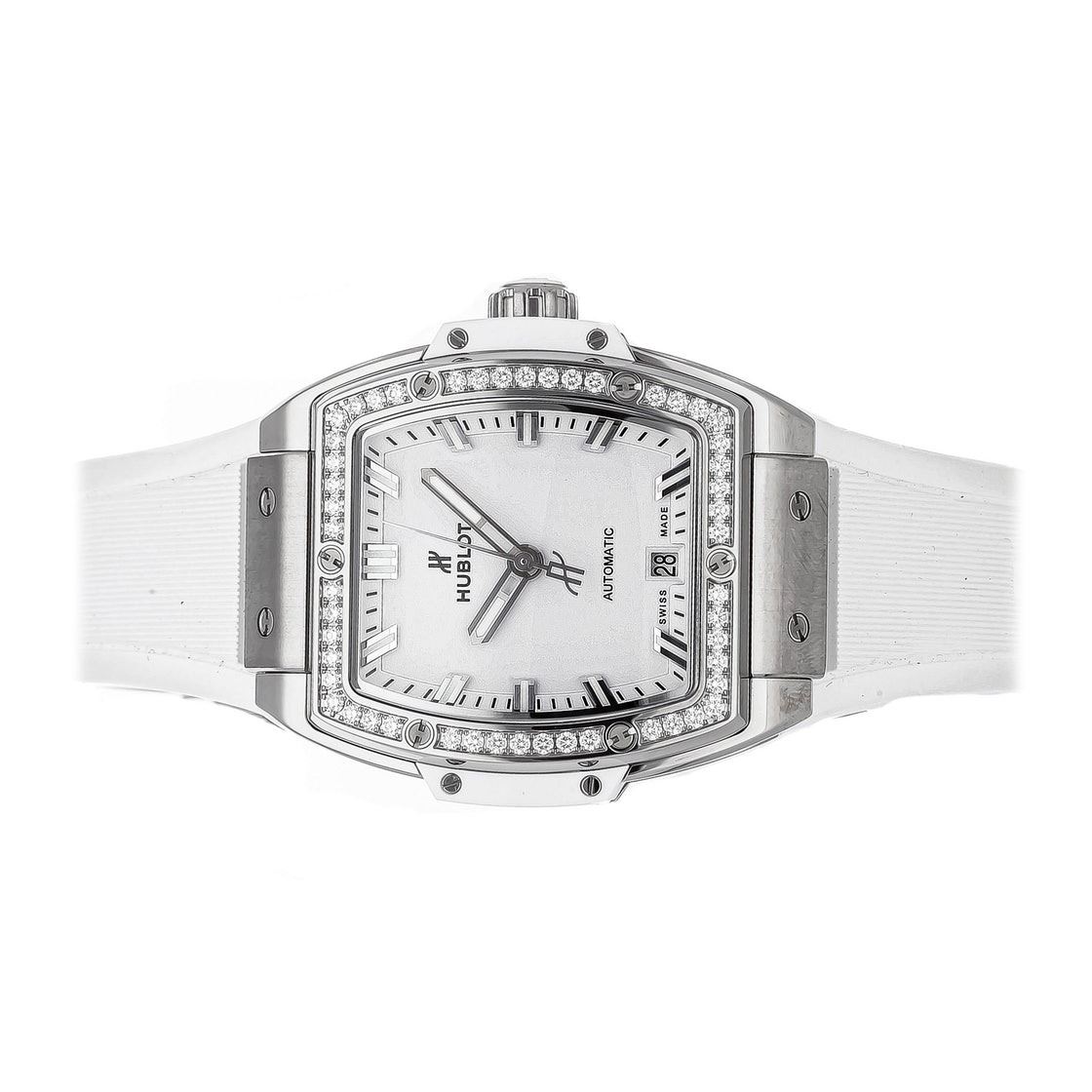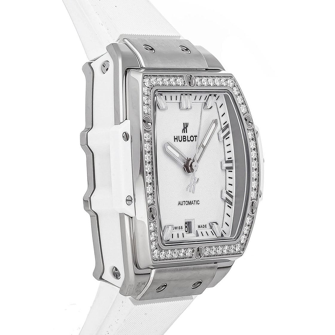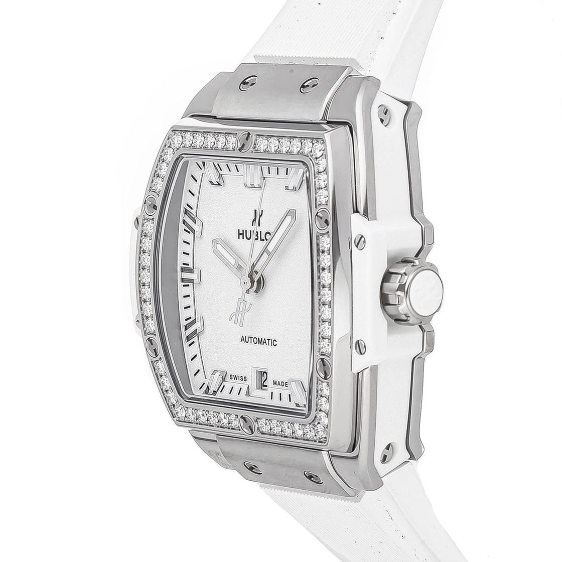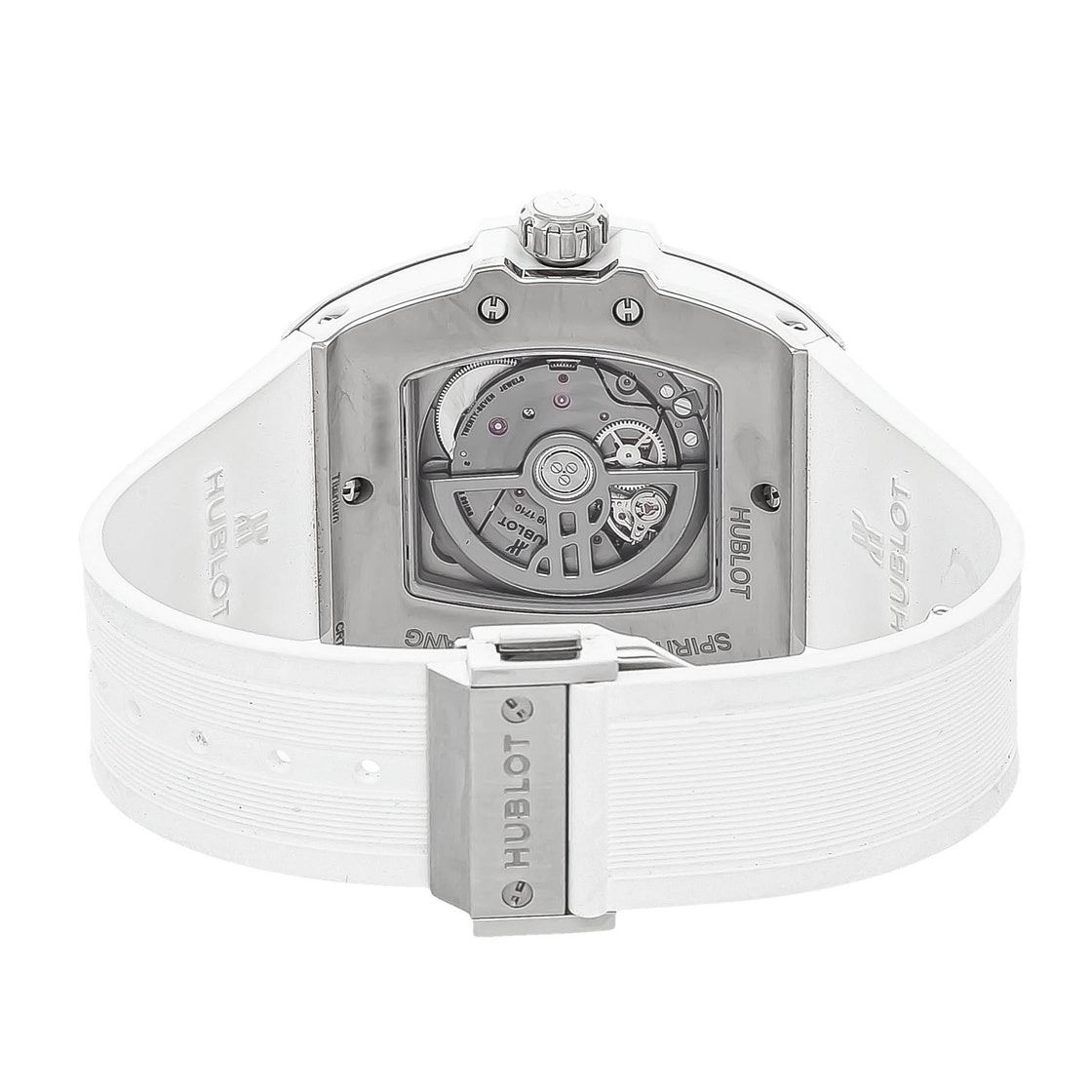 Hublot Spirit of Big Bang (665 NE 2010 RW 1204) self-winding automatic watch, features a 39mm titanium and white ceramic case with a diamond bezel surrounding a white dial on a white rubber strap with a stainless steel deployant buckle.