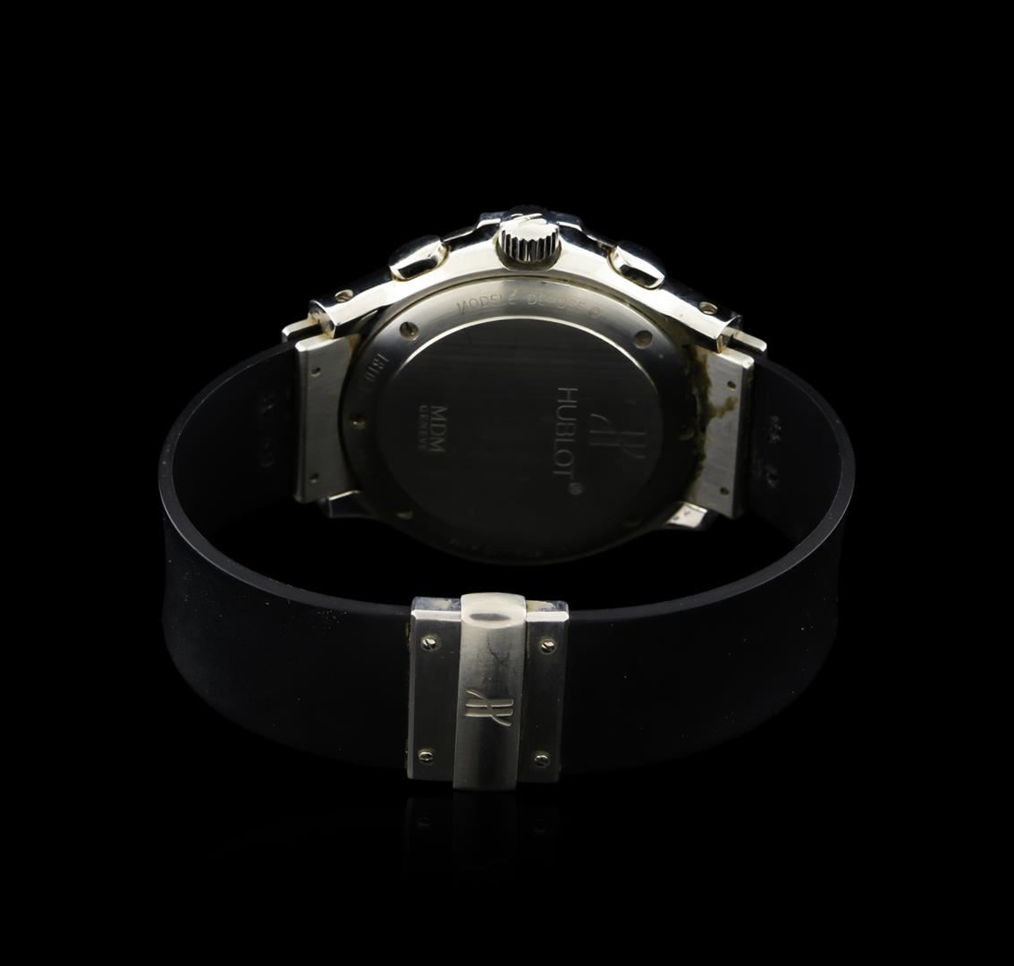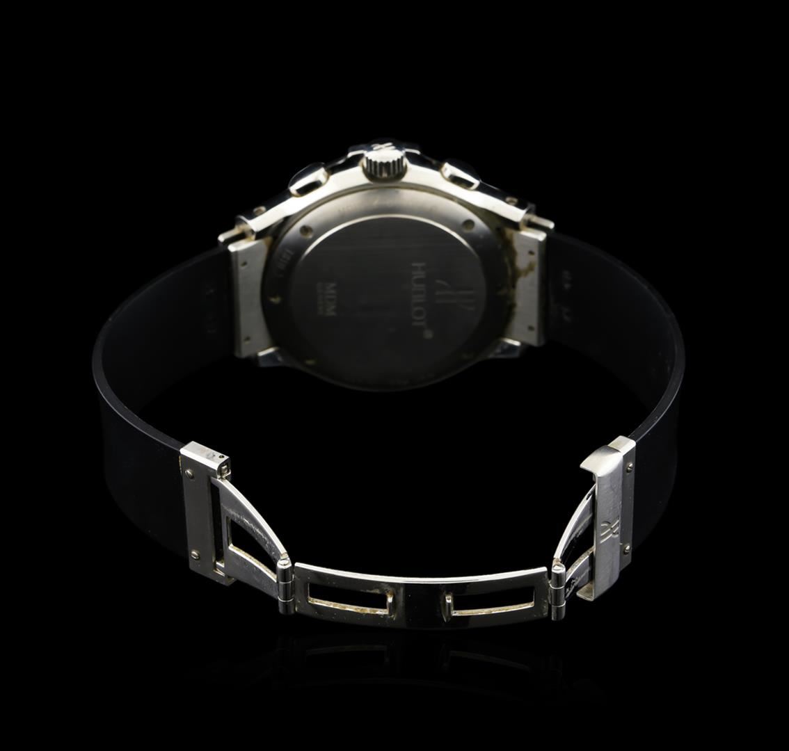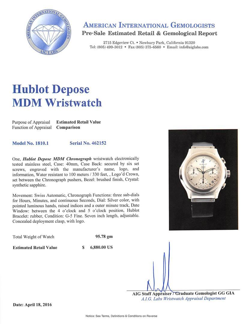 One, Hublot Depose MDM Chronograph wristwatch electronically tested stainless steel, Case: 40mm, Case Back: secured by six set screws, engraved with the manufacturer's name, logo, and information, Water resistant to 100 meters / 330 feet, , Logo'd Crown, set between the Chronograph pushers, Bezel: brushed finish, Crystal: synthetic sapphire. Movement: Swiss Automatic, Chronograph Functions: three sub-dials for Hours, Minutes, and continuous Seconds, Dial: Silver color, with pointed luminous hands, raised indices and a outer minute track, Date Window: between the 4 o'clock and 5 o'clock position, Hublot Bracelet: rubber, Condition: G-5 Fine. Seven inch length, adjustable. Concealed deployment clasp, with logo. Total Weight of Watch 95.78gm. AIG Appraised at $6,880.00.