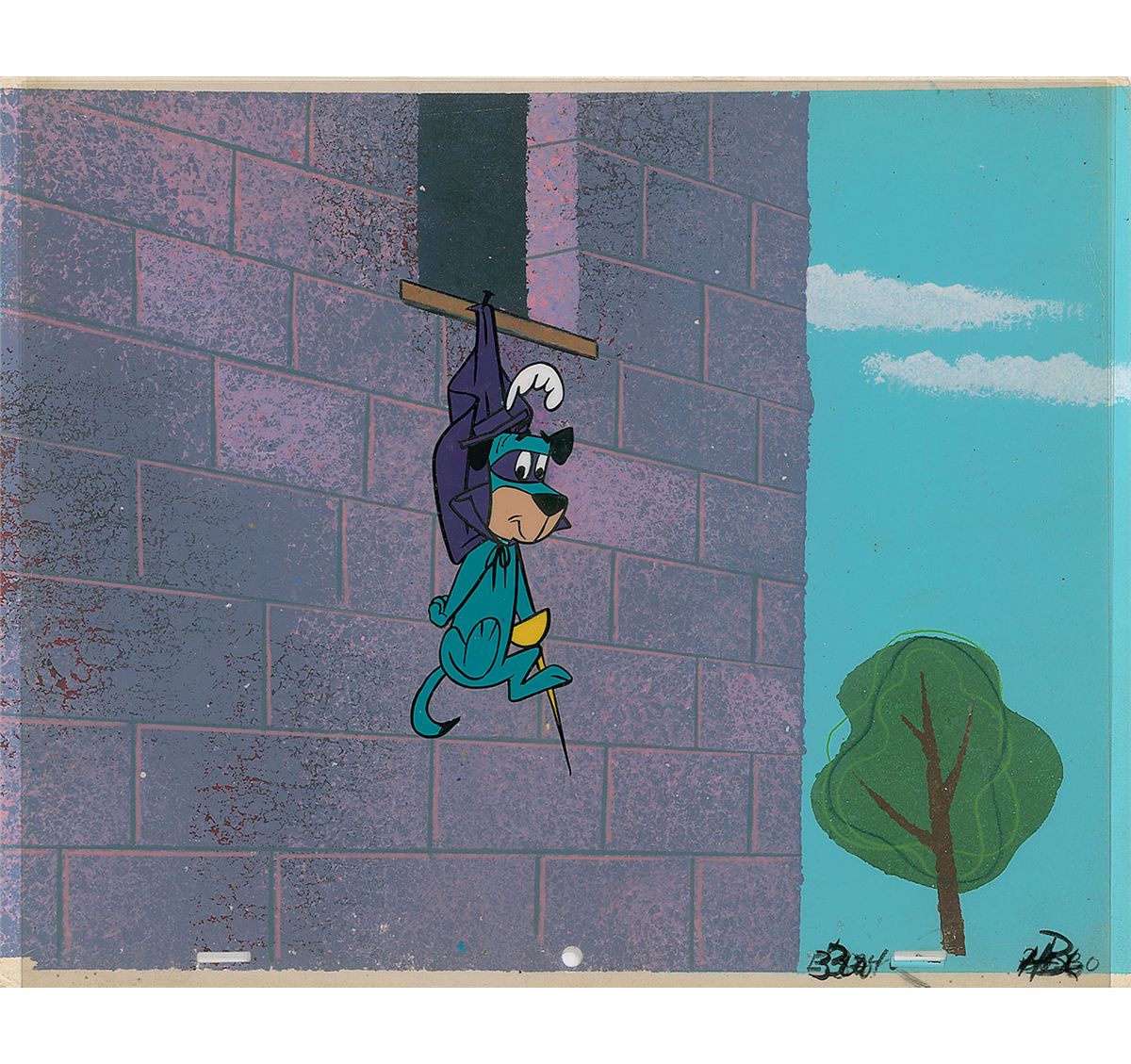 (Hanna-Barbera Studios, 1959) Original production key master background set-up featuring Huckleberry Hound from The Huckleberry Hound Show, showing him perilously hanging out of a window from his cape. The cel is placed on a hand-painted production key master background. Image measures 1.75 x 5, with overall dimensions of 13 x 10.5. In fine condition.