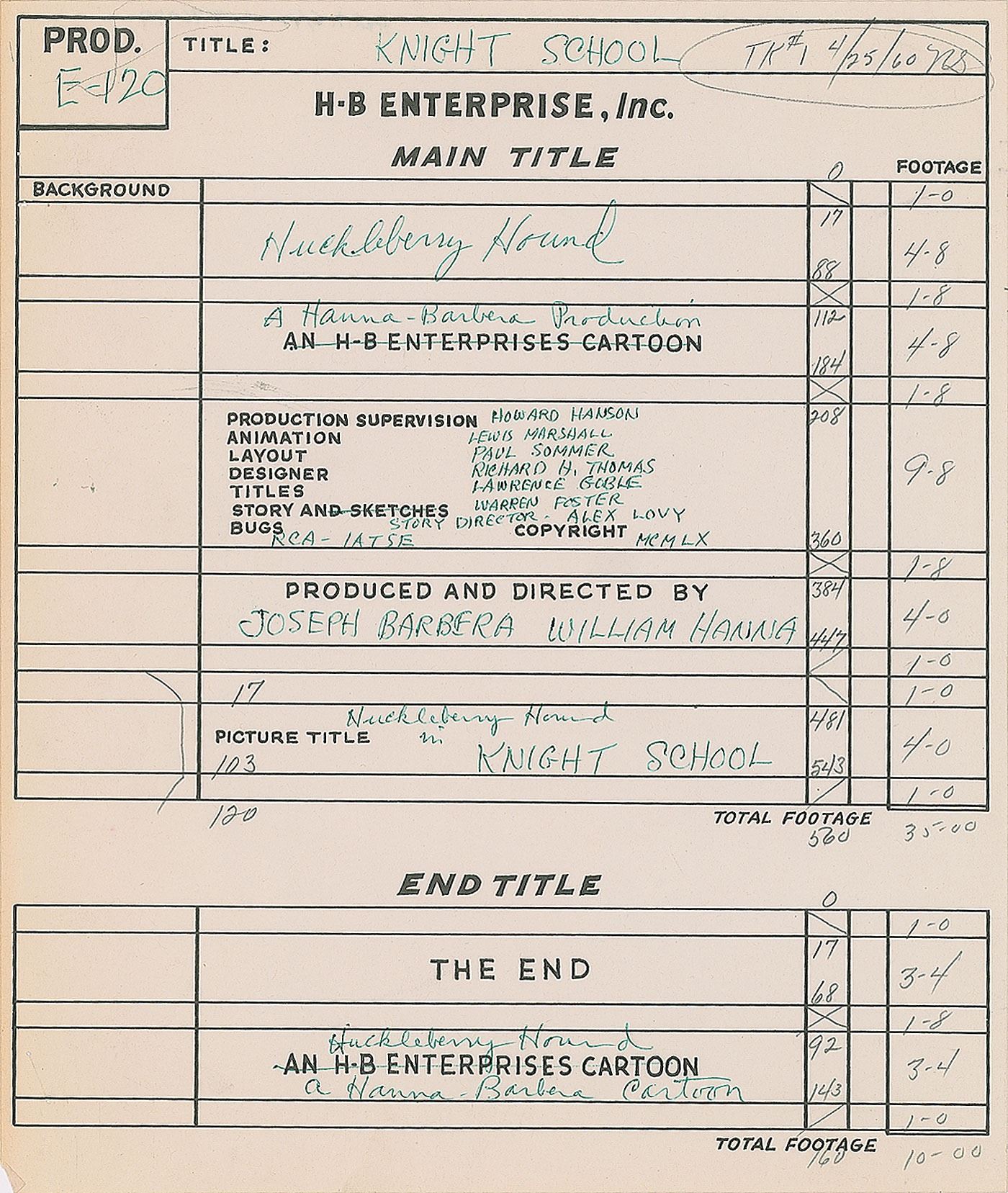 (Hanna-Barbera Studios, 1960) Rare original production key master background set-up for "Huckleberry Hound in Knight School," featuring the lead character dressed as a knight along with the title card text. The cels are placed on a matching hand-painted production background. Character image measures 2.5 x 4.25, with overall dimensions of 13 x 10.5. In fine condition. Accompanied by the "H-B Enterprise" credit sheet for Knight School.