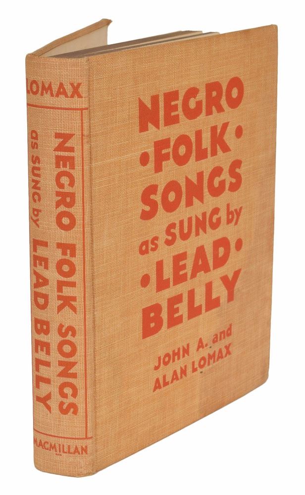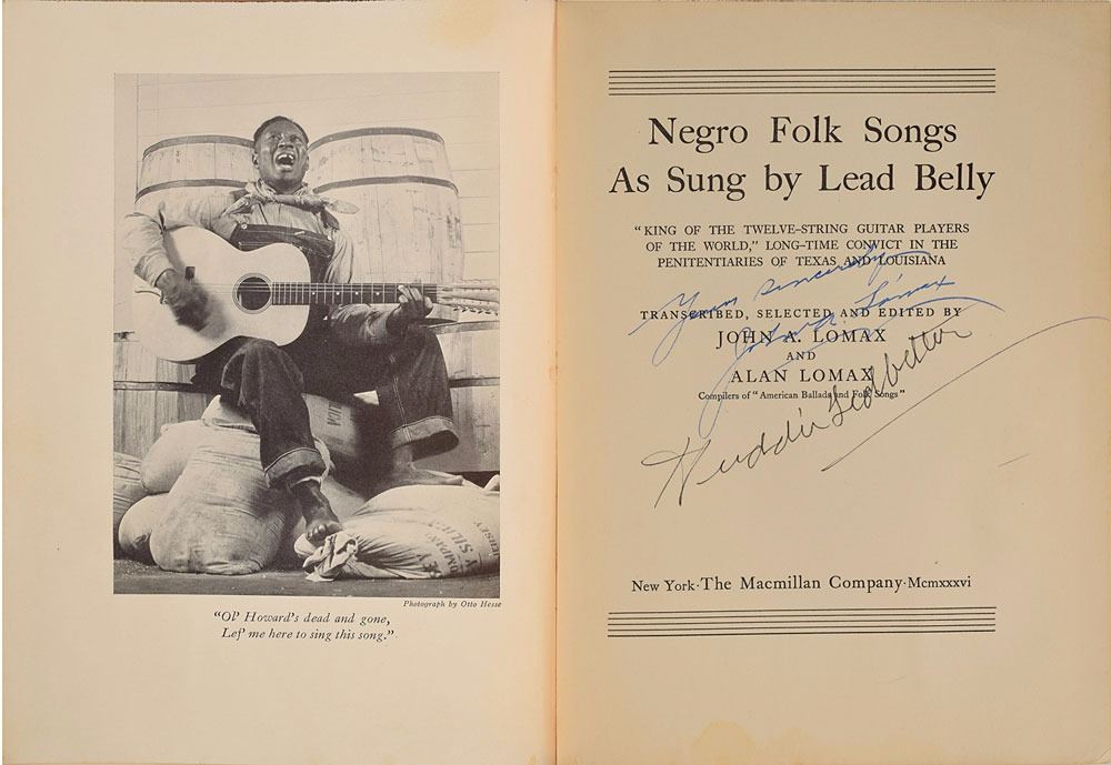 Signed book: Negro Folk Songs As Sung by Lead Belly. First edition. NY: The Macmillan Company, 1936. Clothbound hardcover, 7.5 x 9.5, 242 pages. Signed on the title page in black, "Huddie Ledbetter," as well as in blue ink by the author, "Yours sincerely, John A. Lomax." Collector's notation to first free end page. In very good to fine condition, with slight scattered toning to opening pages, including the signed page (restricted to the bottom edge, in no way affecting the bold signature); boards and pastedowns feature some faint water damage and creasing. Father-and-son folklorists John and Alan Lomax discovered Ledbetter at Louisiana's Angola Prison Farm in the summer of 1933. They recorded the 12-string guitarist—then serving a four-year sentence for attempted homicide—and, deeply impressed, they returned a year later with even better equipment to record hundreds of his songs. Upon his release in 1934, Ledbetter helped the Lomaxes with their folk song collecting around the South, and then later assisted them with recording songs and compiling interviews for their forthcoming book, Negro Folk Songs As Sung by Lead Belly. Autographic material from Leadbelly remains extremely scarce.